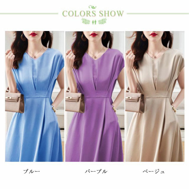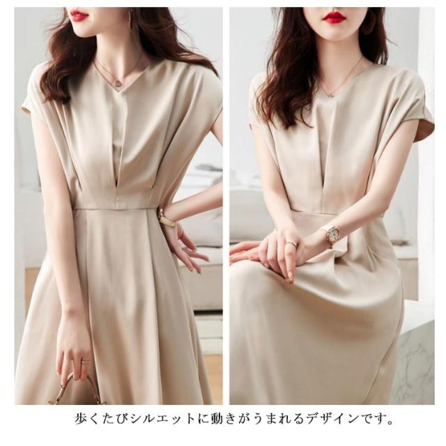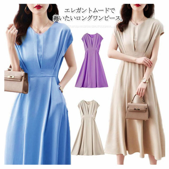 【送料無料】セレモニー ワンピース ワンピ ロングワンピース ドレス フレンチスリーブ Vネック フレアワンピース 体型カバー 結婚式 通勤 オフィス 発表会 お仕事 大きいサイズ ベージュ ブルー 20代 30代 40代 50代