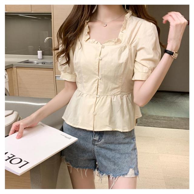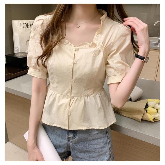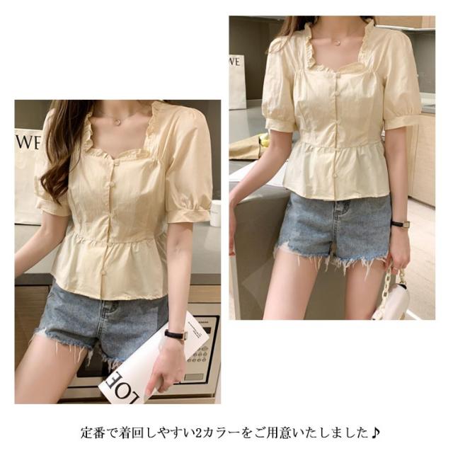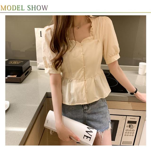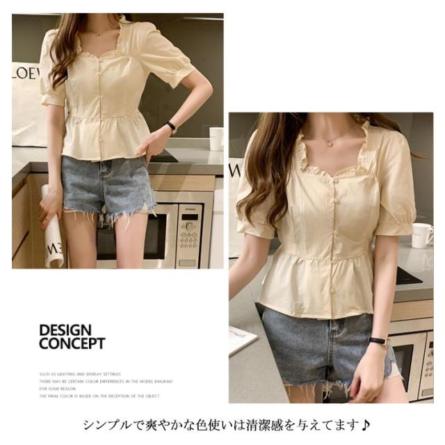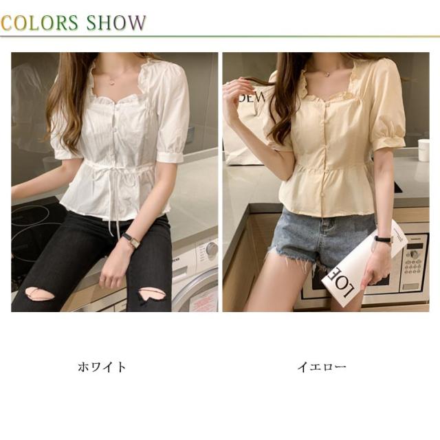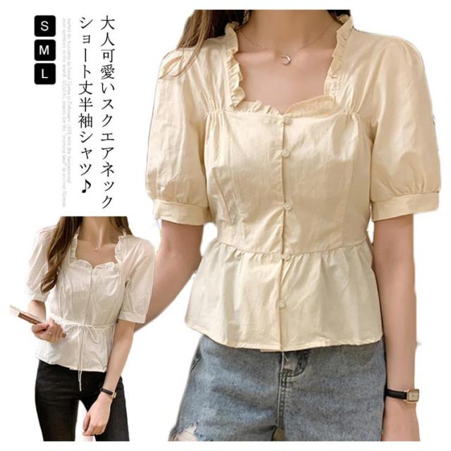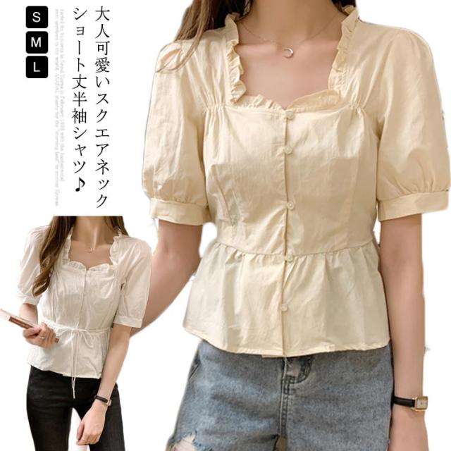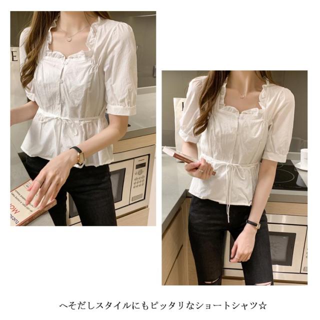 シャツ レディース 半袖シャツ ショートシャツ シャツブラウス ショート丈 半袖 ボリュームスリーブ フリル へそだし ボートネック メリハリ 薄手 無地シャツ トップス プルオーバー セクシー お洒落 夏物 夏新作