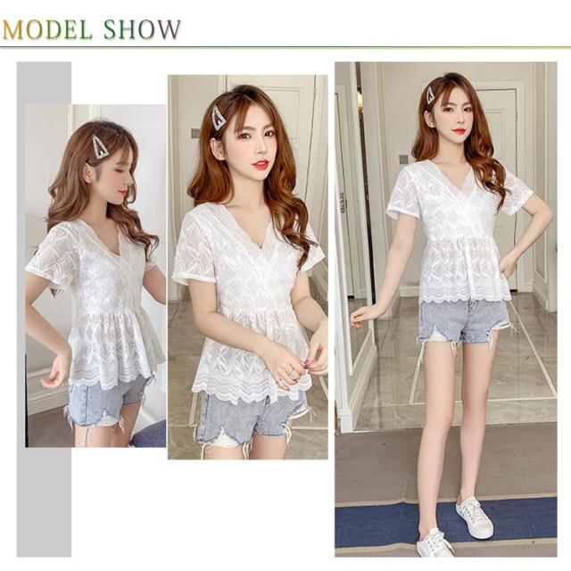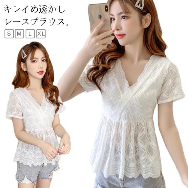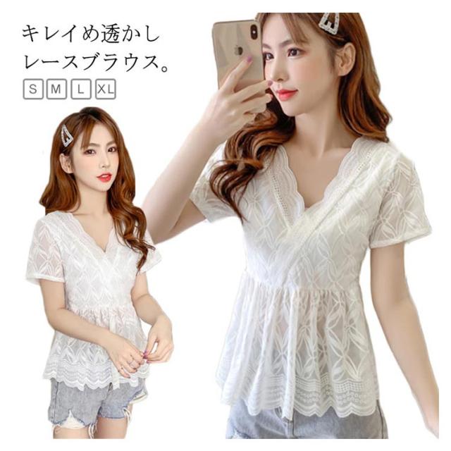 レースブラウス レディース フレアブラウス ブラウス レース付き 透かしレース Vネック 花柄レース フラワーレース 半袖 透け感 ウェスト締める 鎖骨見せ 大人 エレガント ナチュラル 上品 普段着 お洒落 キレイめ トップス 夏新作