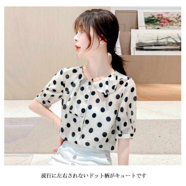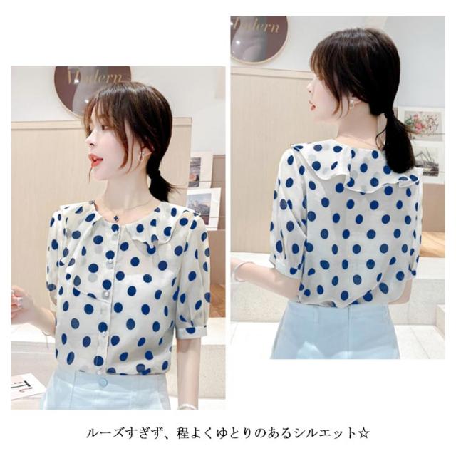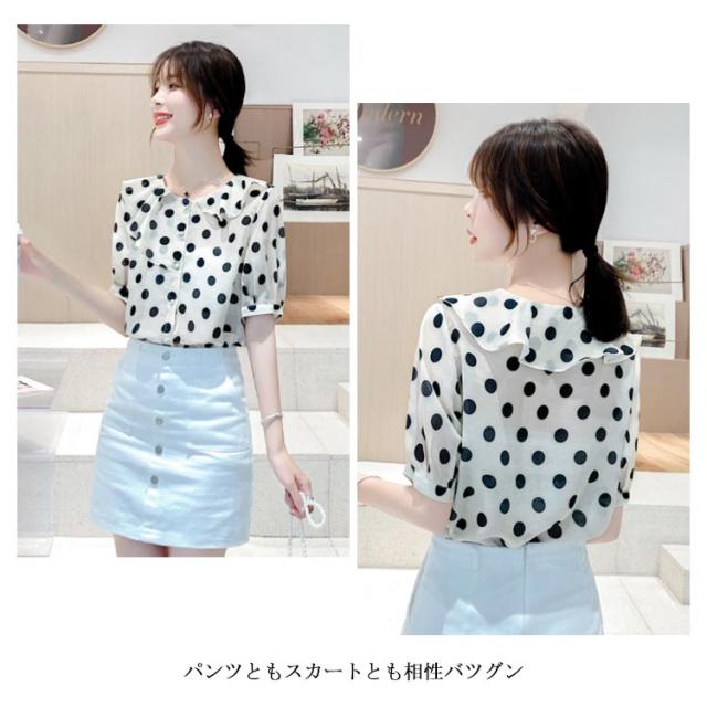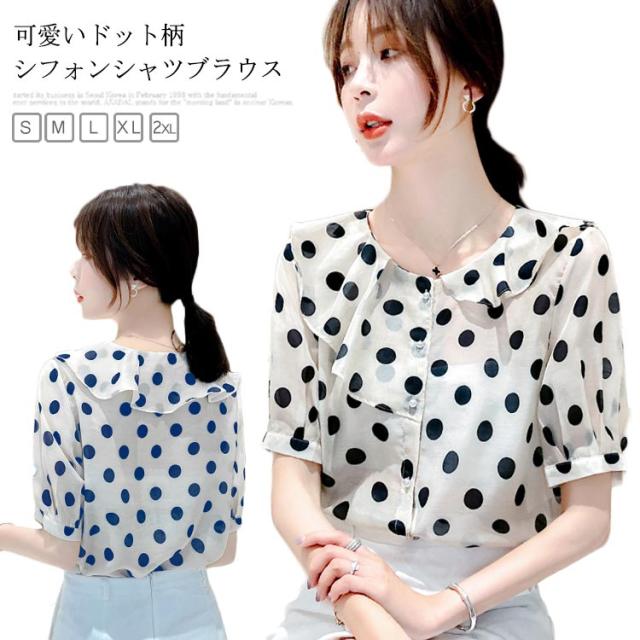ブラウス レディース シフォン ブラウス 半袖ブラウス ドット柄フラウンス シフォン ドット柄 水玉柄 無地 折り襟 カジュアル 体型カバー エレガント キレイめ トップス 夏新作