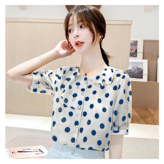 | 可愛いドット柄シフォンシャツブラウス 流行に左右されないドット柄がキュートです きちんとした折り襟で清楚な印象を与えます パンツともスカートとも相性バツグン | |
