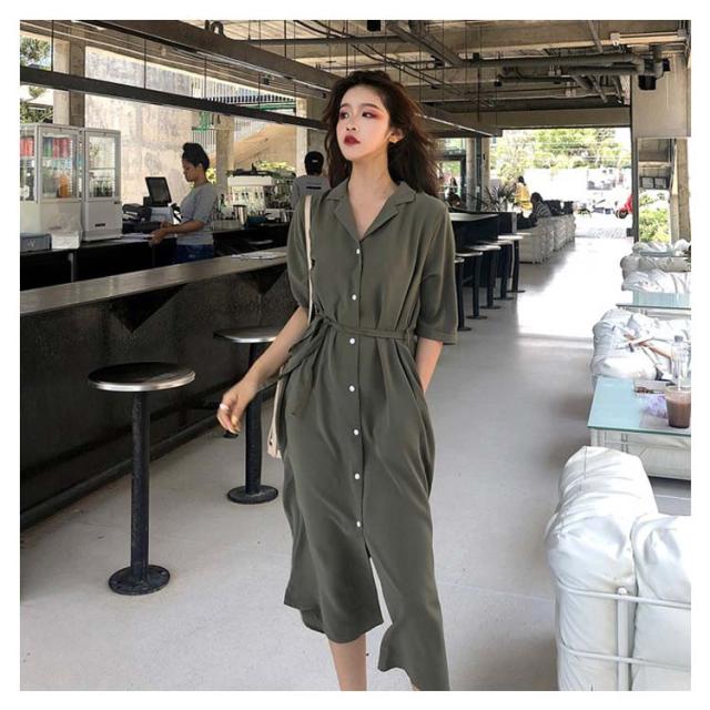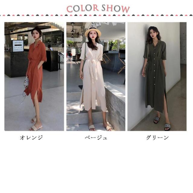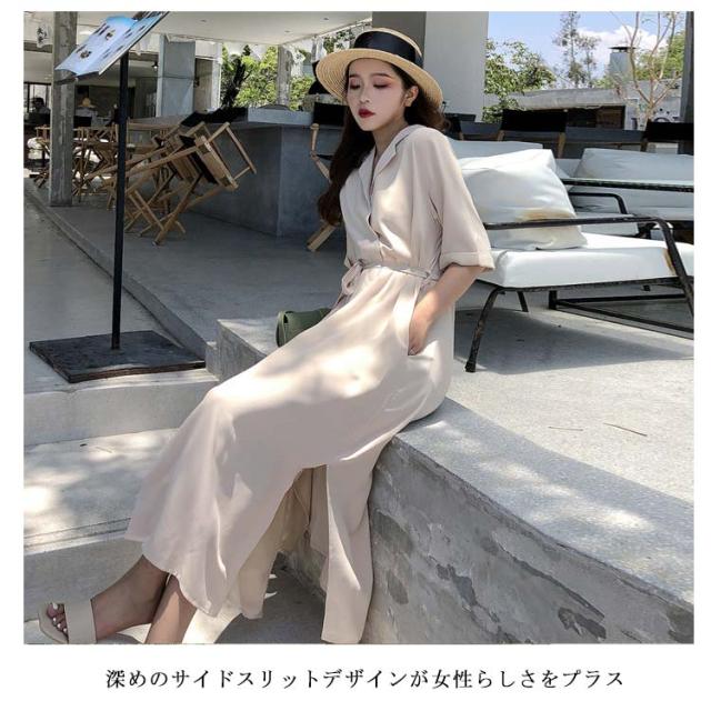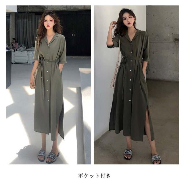 オープンカラー シャツワンピース 半袖ワンピース 羽織り カーディガン レディース 送料無料 スリット入り 5分袖 ロング丈 膝下 ミモレ丈 ポケット付き