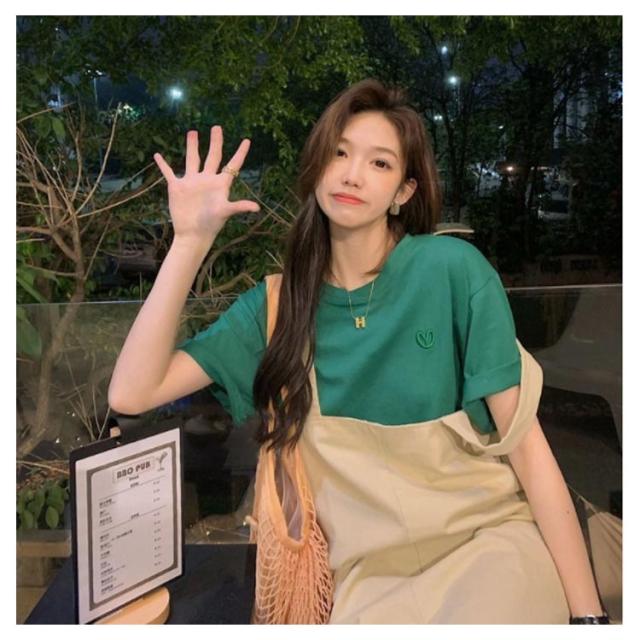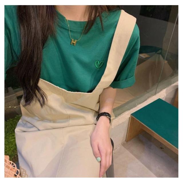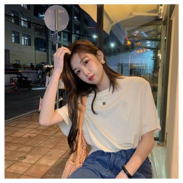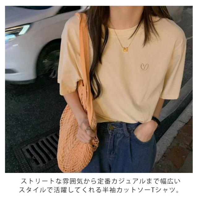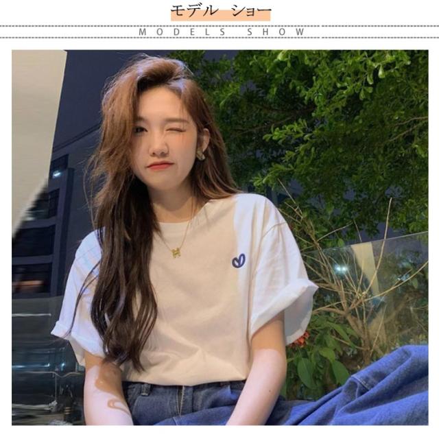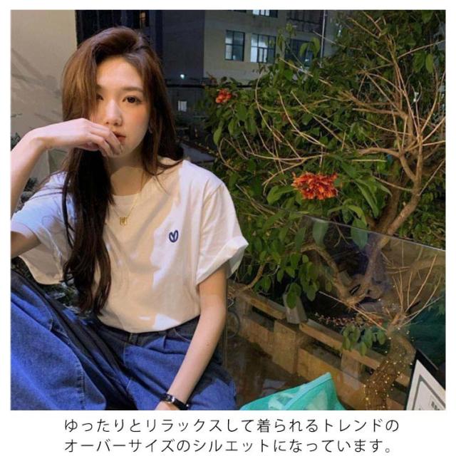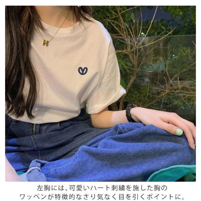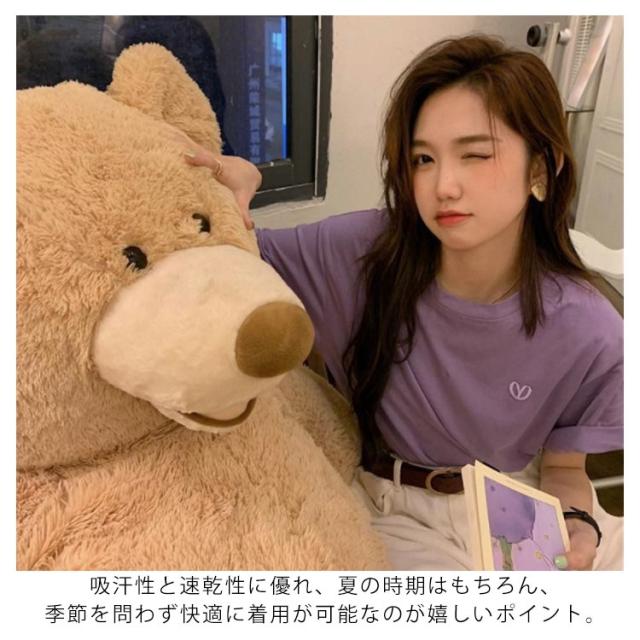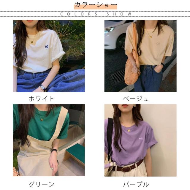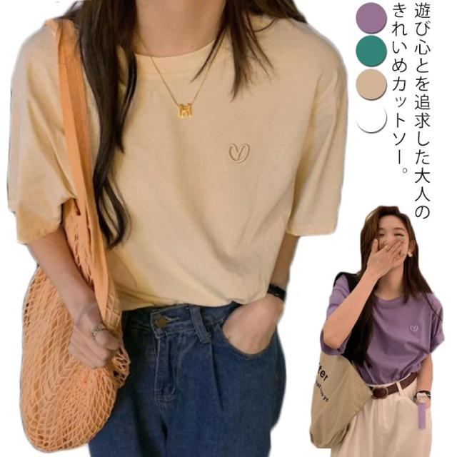 カジュアル ハート 半袖 レディース ワンポイント 刺? 丸首 丸首 シンプル オーバーサイズ 女の子 学生 韓国風 コーデ 可愛い 【送料無料】Tシャツ ホワイト ベージュ グリーン パープル カットソー