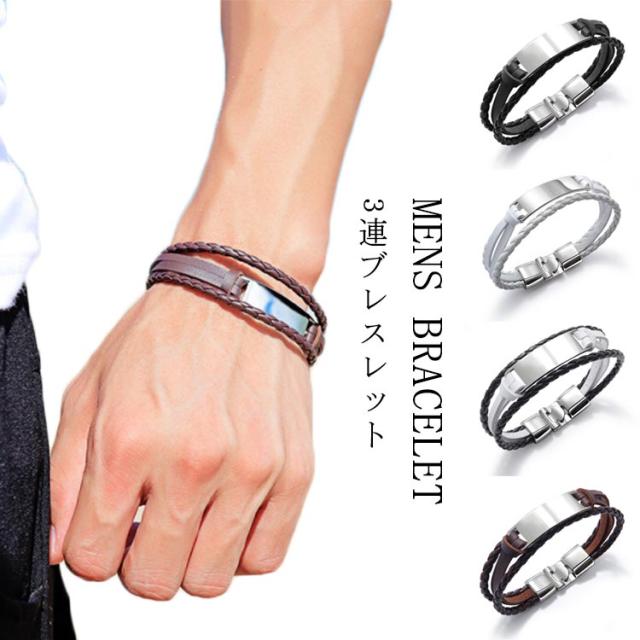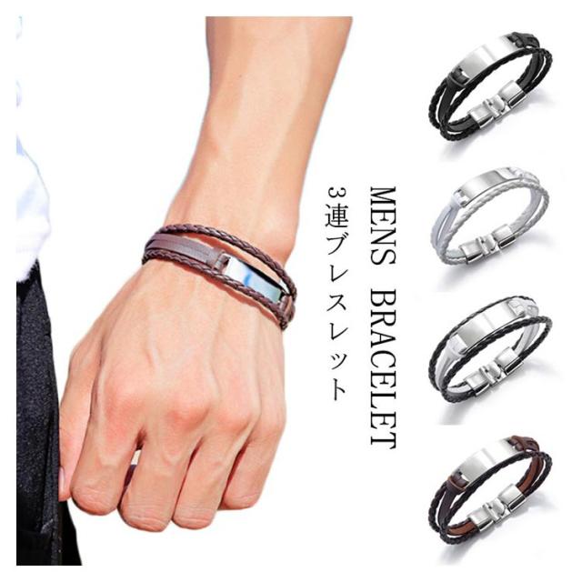 3連 ブレスレット 編み込み ブレスレット PU レザー ブレスレット ブレスレット メンズ 3重 ブレスレット バングル ブレス アクセサリー アメカジ 男性 彼氏 父 誕生日 メール便 送料無料
