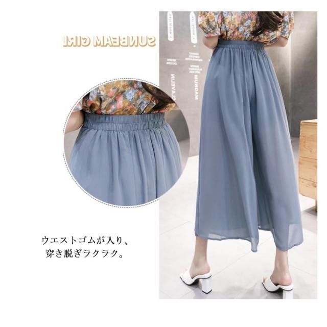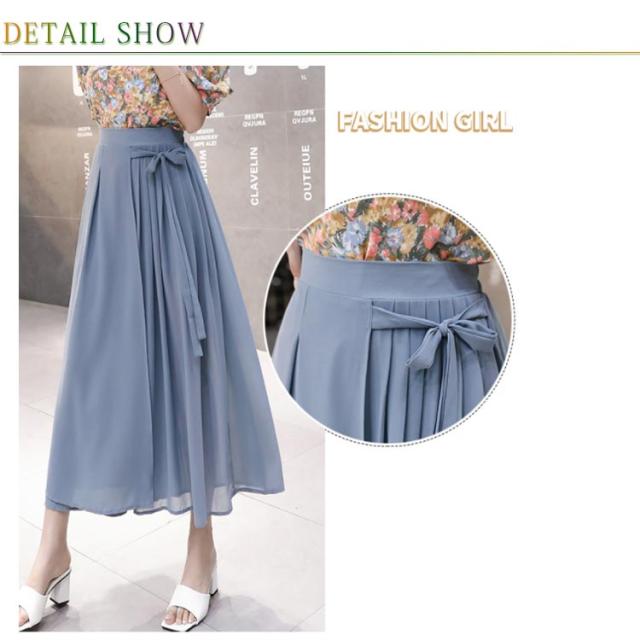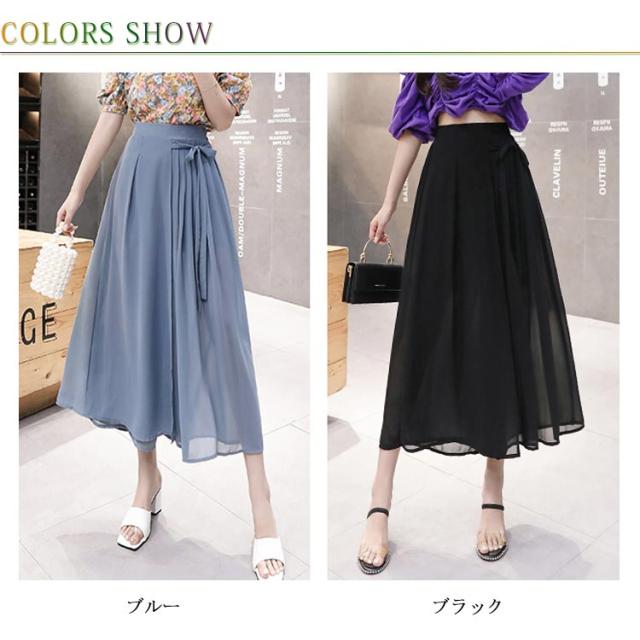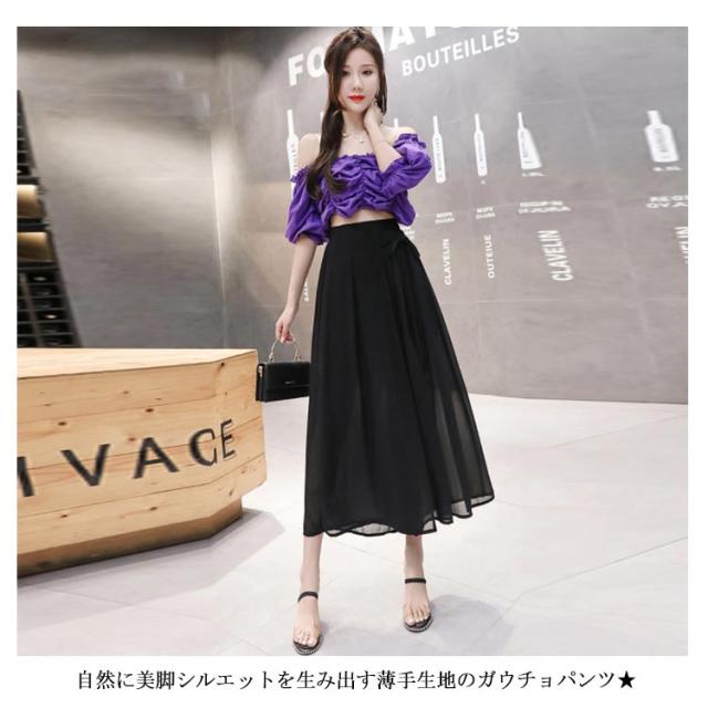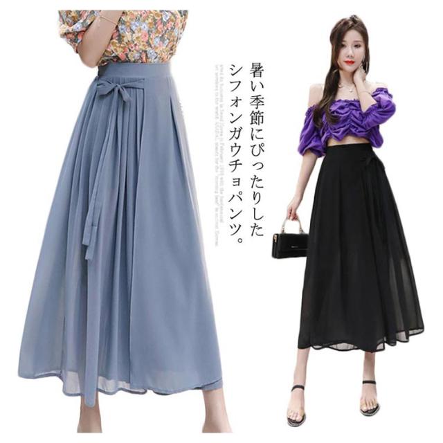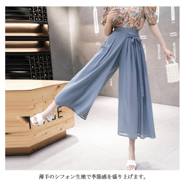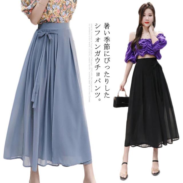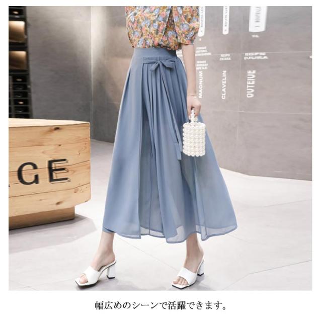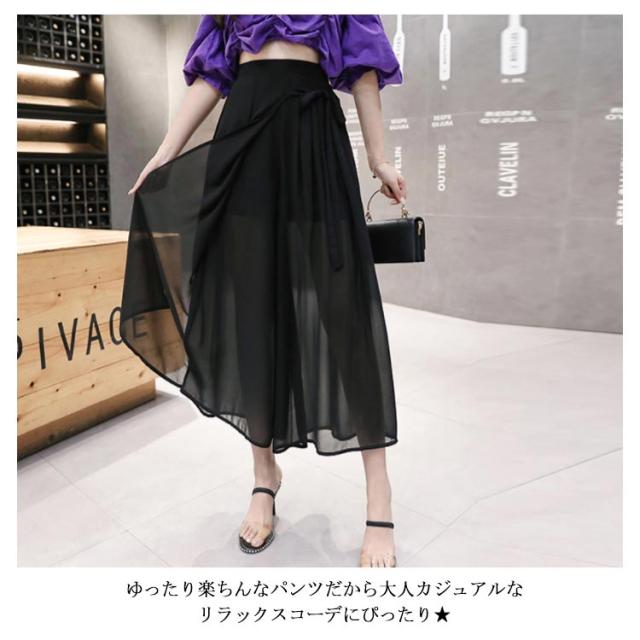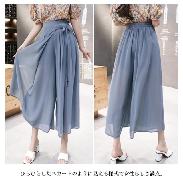 シフォンガウチョパンツ レディース パンツ ガウチョパンツ シフォンパンツ 九分丈パンツ ガウチョ スカーチョ スカンツ ワイドパンツ ウエストゴム リボン付き 透け感 ゆったり 体型カバー フェミニン ボトムス 夏新作