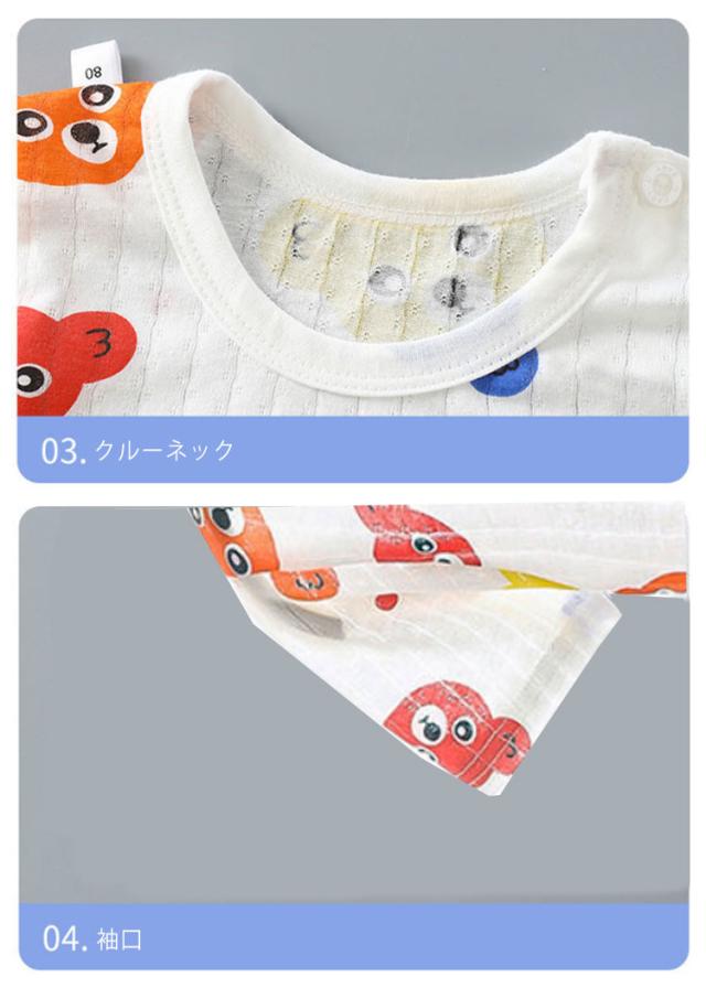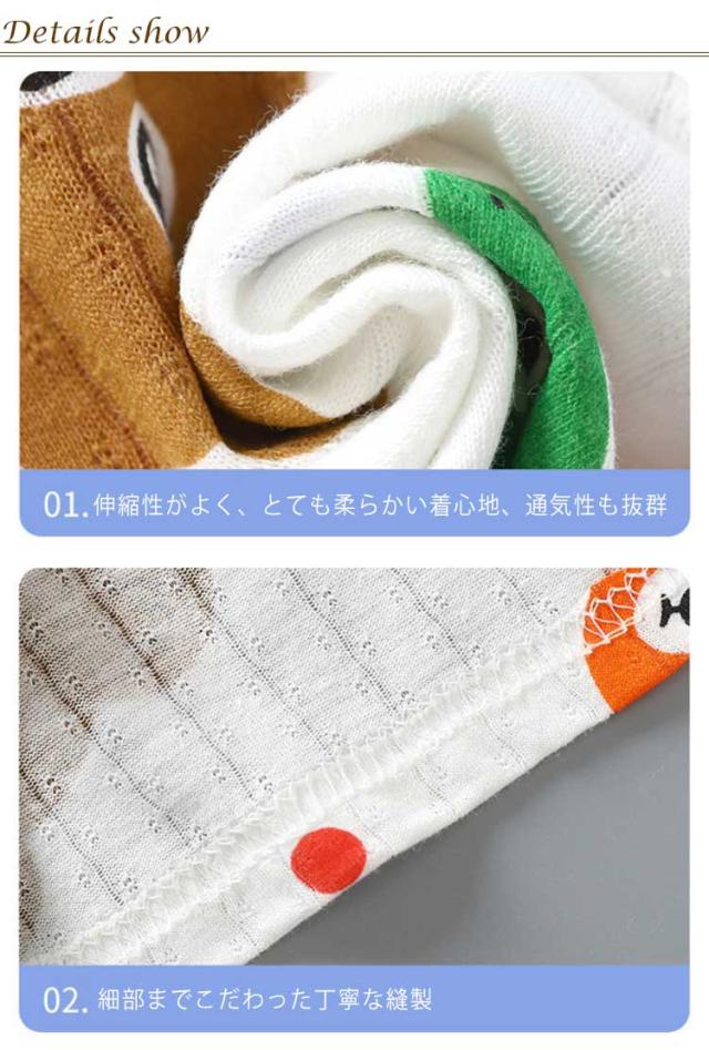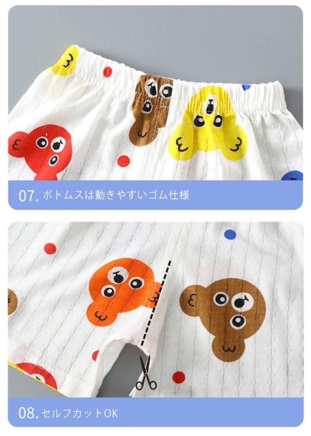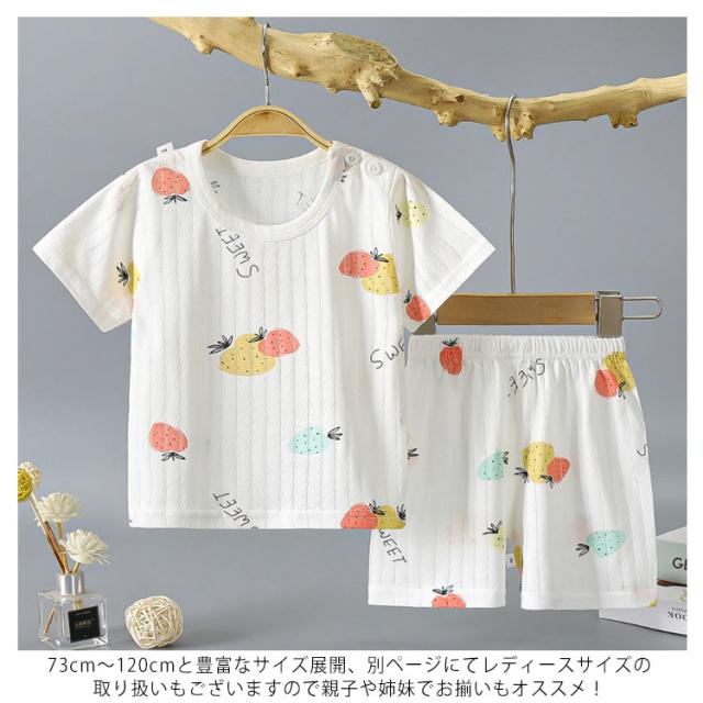 | コットン素材が肌に心地良い、キッズ向け夏用ルームウェア。 薄手で涼しい、伸縮性がよく、とても柔らかい着心地。 ボトムスは動きやすいゴム仕様。 73cm〜120cmと豊富なサイズ展開、別ページにてレディースサイズの取り扱いもございますので親子や姉妹でお揃いもオススメ! 豊富なデザインからお好みを選んでくださいね。 | |