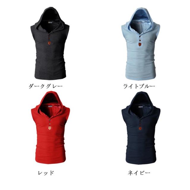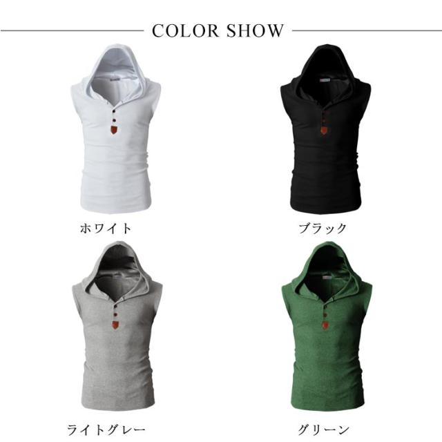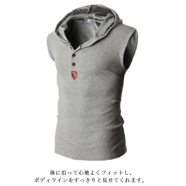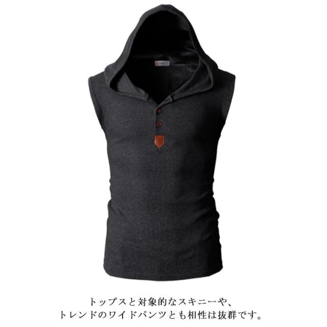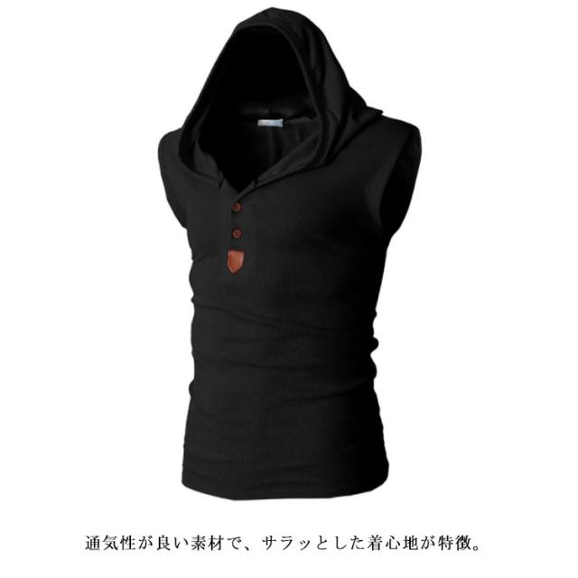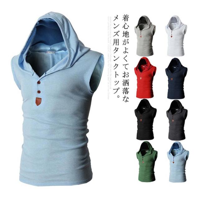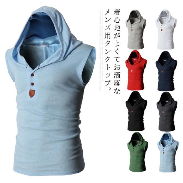 Tシャツ メンズ ノースリーブ タンクトップ 夏物 フード付き カットソー トップス カジュアル カラバ 着痩せ お洒落 メンズファッション