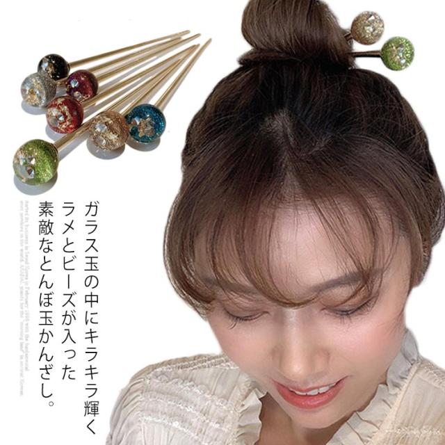 とんぼ玉かんざし ガラス キラキラ 送料無料 髪飾り ヘアアクセサリー 一本 挿し ラメ ビーズ入り 玉かんざし 着物 浴衣 和装 成人式 七五三 ヘッドアクセ まとめ髪 簪