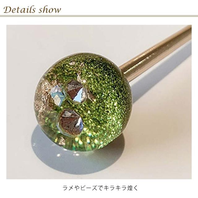 | ガラス玉の中にキラキラ輝くラメとビーズが入った素敵なとんぼ玉かんざし。 シンプルながら存在感ある可愛いヘアアクセサリー。 髪に映える美しい光沢、着物や浴衣着用する際彩る可愛らしい人気かんざし。 着物はもちろん、お洋服にも使いやすい玉かんざし。 トレンドのハーフアップやおだんごスタイルに使えてとても可愛い。 | |