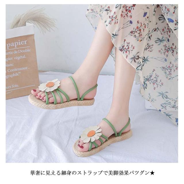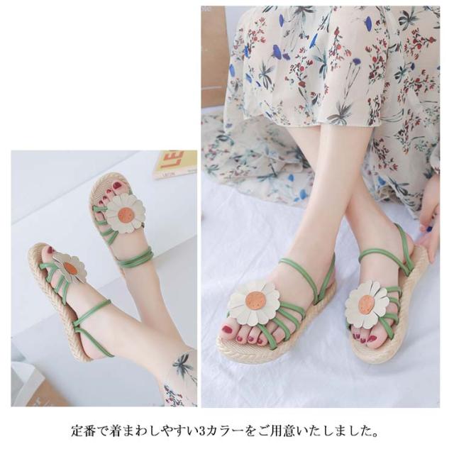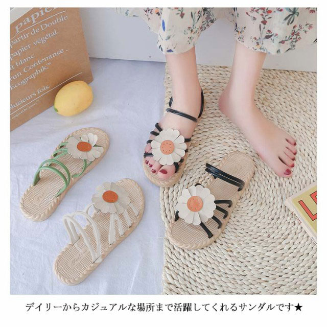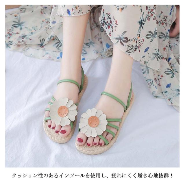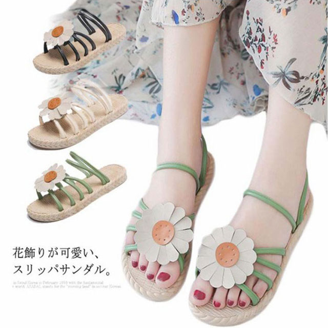 スリッパサンダル レディース サンダル フラットサンダル 花飾り お花付き ストラップサンダル フラットソール ローヒール 麦わら模様 キレイめ カジュアル シンプル 爽やか お洒落 靴 シューズ 夏物 夏新作