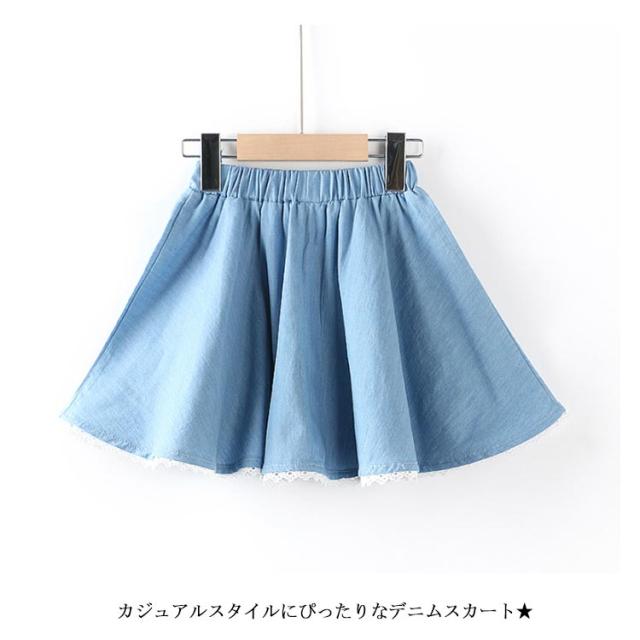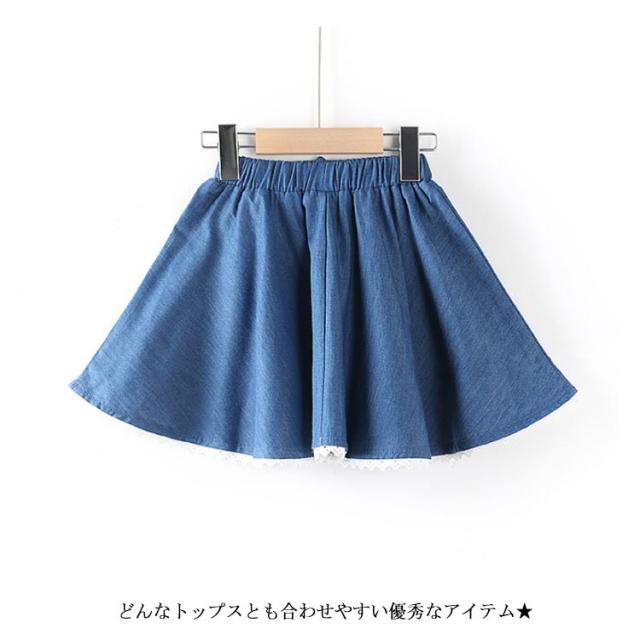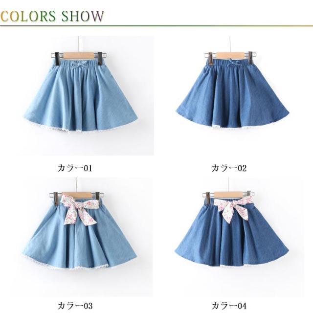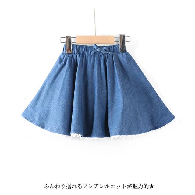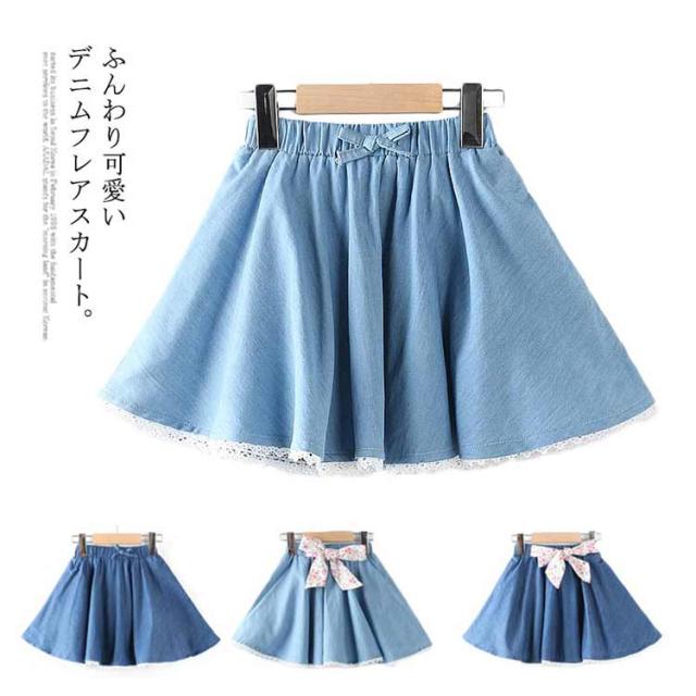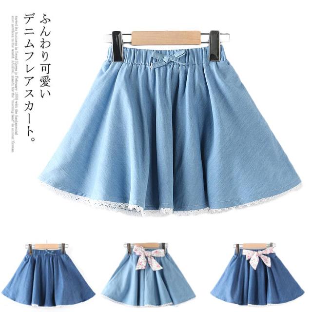 デニムスカート 子供服 スカート フレアスカート ミディアムスカート デニム リボン付き ウエストゴム 色落ち ウォッシュ加工 可愛い お洒落 カジュアル 女の子 女児 ガールズ ボトムス 夏新作