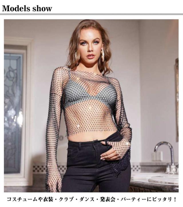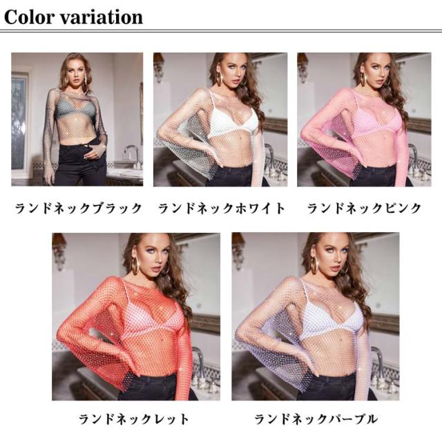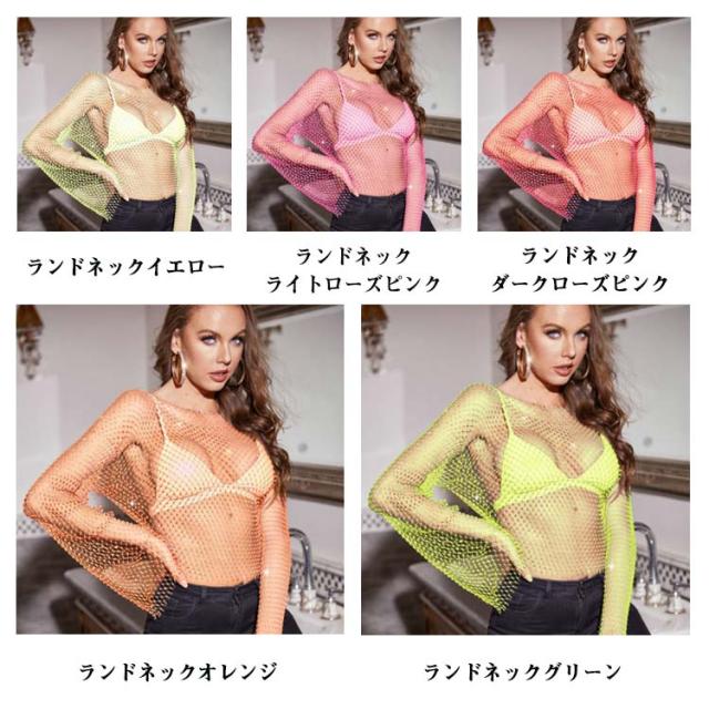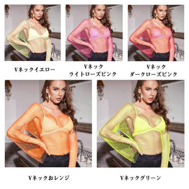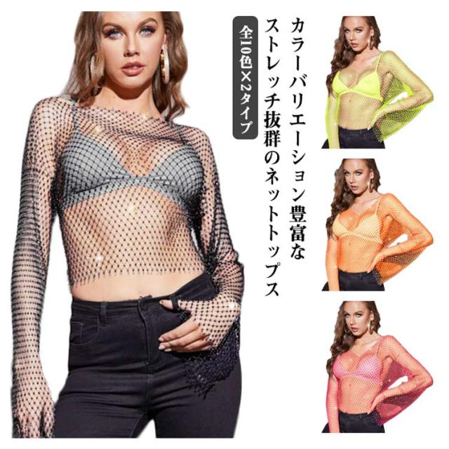 全10色×2タイプ レディース ダンス 衣装 メッシュ トップス ショート丈 ランドネック Vネック トップス シースルー カットソー 長袖 キラキラ へそ出し トップス 透け感 おしゃれ かっこいい セクシー 黒