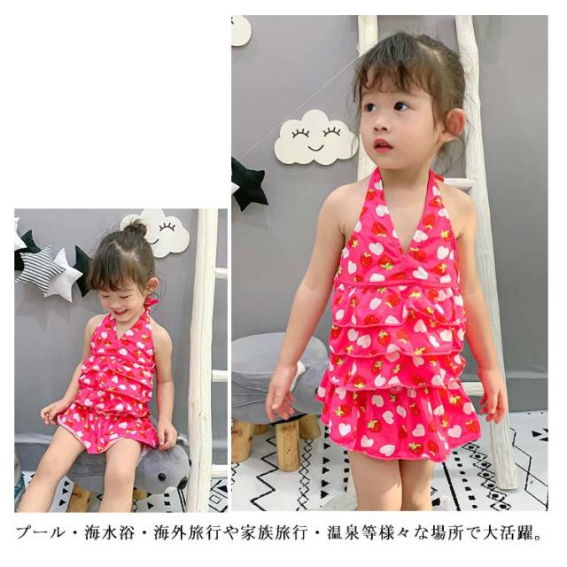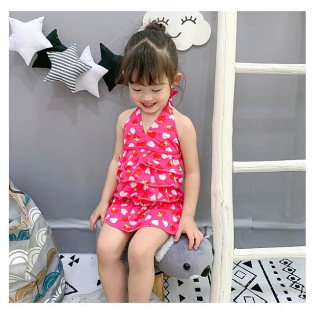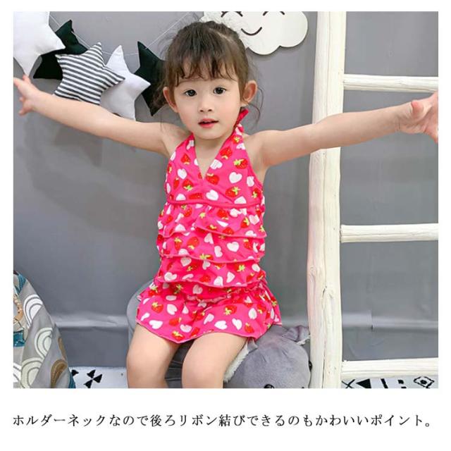 | かわいい子供水着の登場。 ホルダーネックなので後ろリボン結びできるのもかわいいポイント。 女の子らしい苺柄とドット柄を取り入れます。 プール・海水浴・海外旅行や家族旅行・温泉等様々な場所で大活躍。 | |