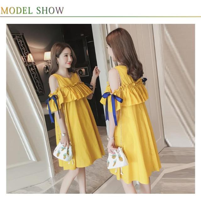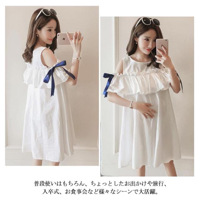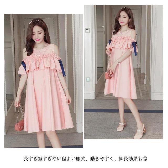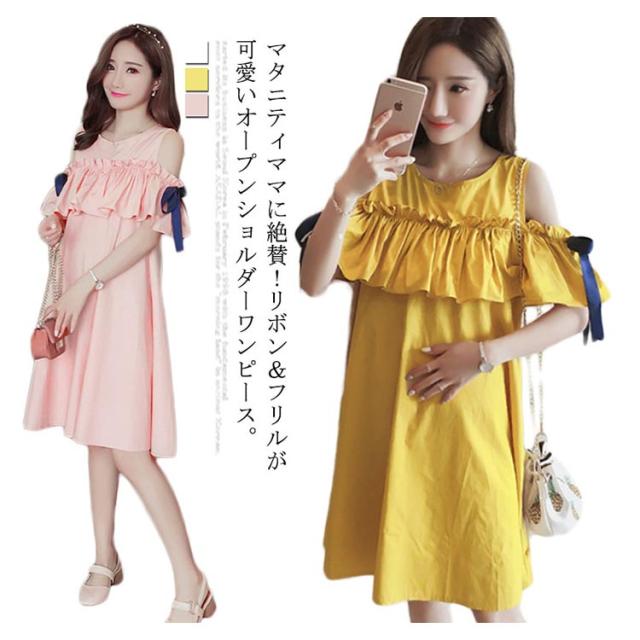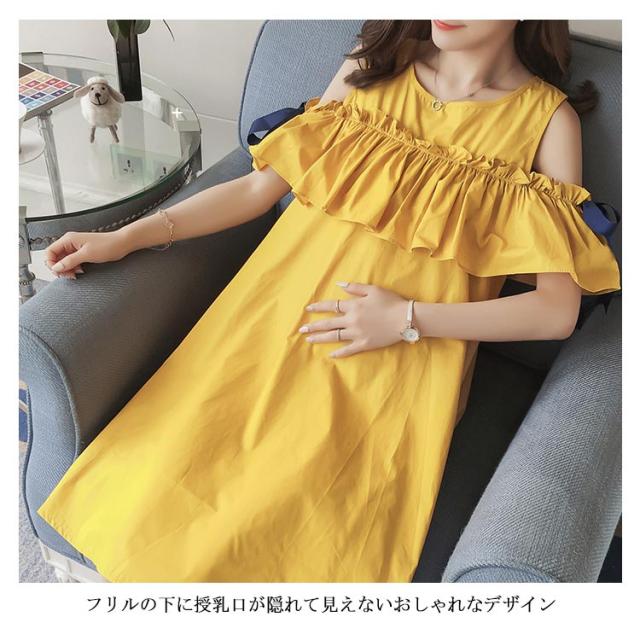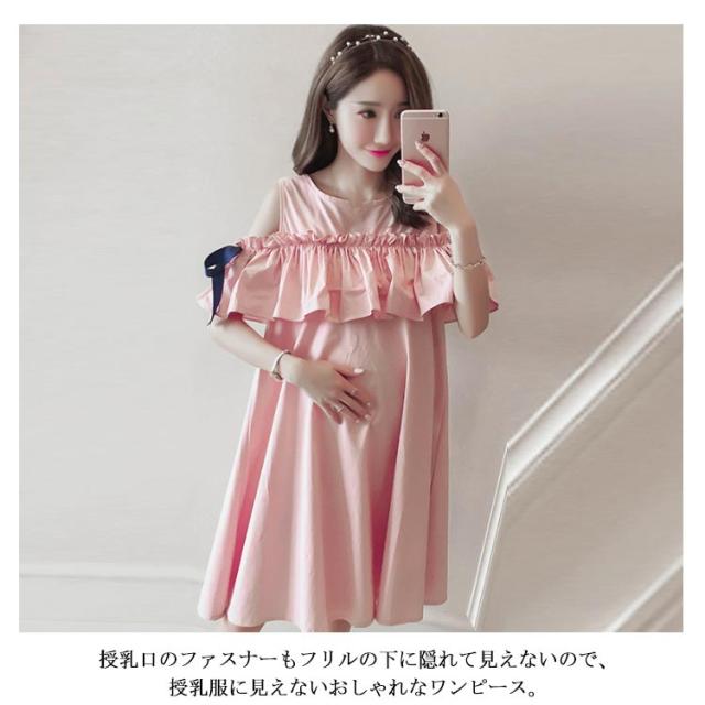 授乳口付き ワンピース 授乳服 マタニティウェア 送料無料 Aライン フレア フリル オープンショルダー オフショルダー 産前 産後 リボン 膝丈 春 夏 おしゃれ 可愛い 妊娠服