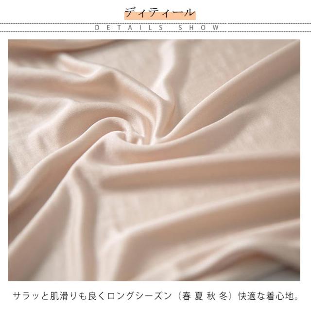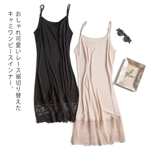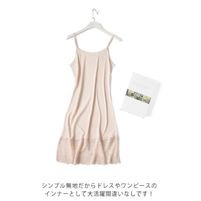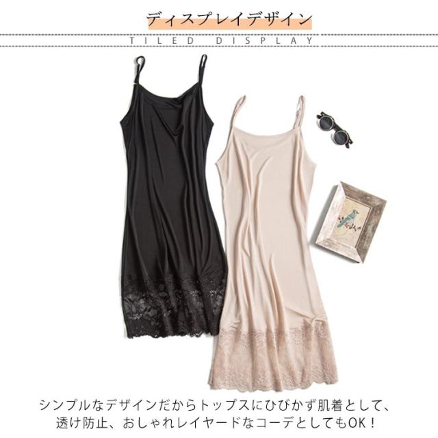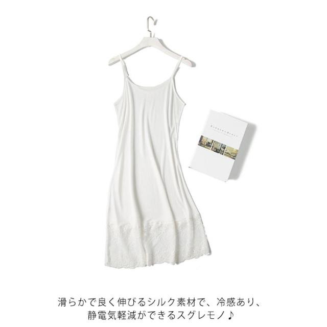 | おしゃれ可愛いレース裾切り替えたキャミワンピースインナー。 シンプルなデザインだからトップスにひびかず肌着として、透け防止、おしゃれレイヤードなコーデとしてもOK! タイトなシルエットで体にぴったりとフィットして、女性らしいセクシーさもアピール。 滑らかで良く伸びるシルク素材で、冷感あり、静電気軽減ができるスグレモノ♪ サラッと肌滑りも良くロングシーズン(春 夏 秋 冬)快適な着心地。 シンプル無地だからドレスやワンピースのインナーとして大活躍間違いなしです! | |