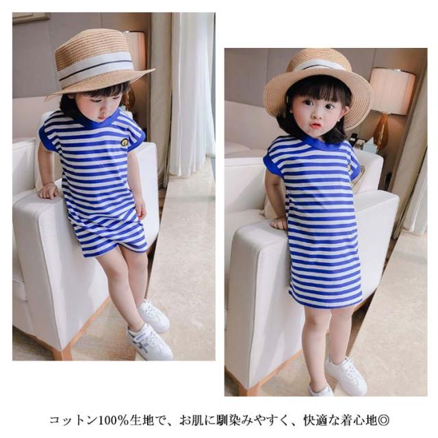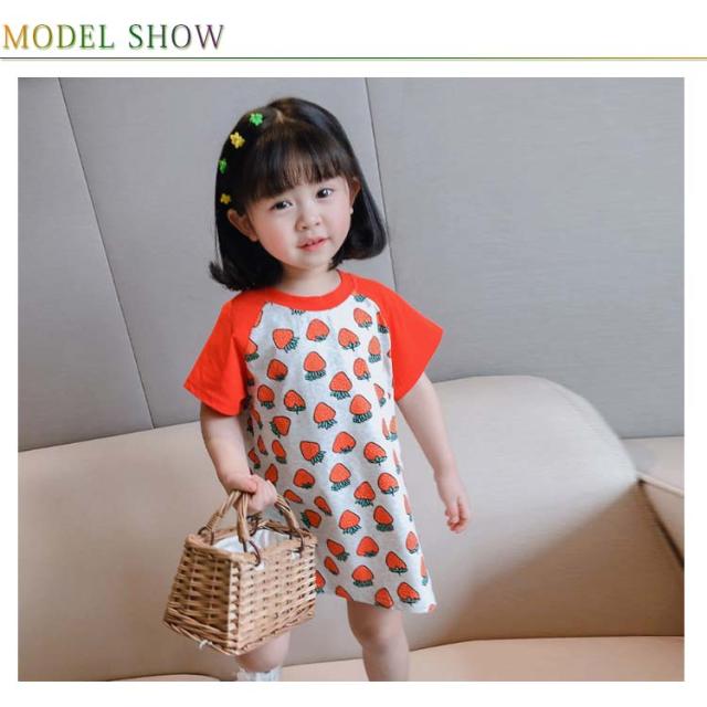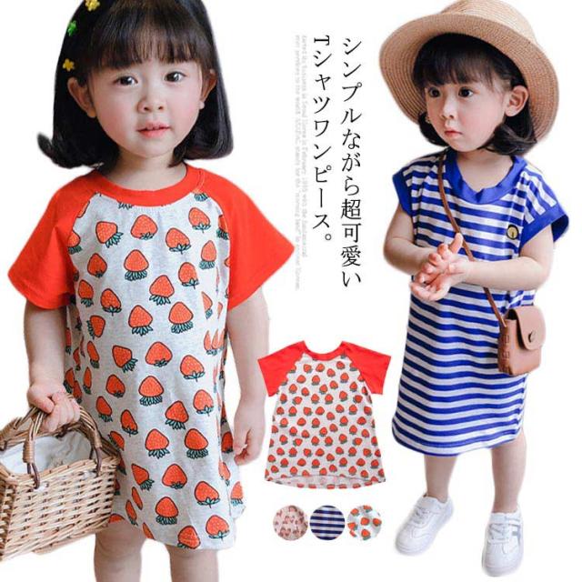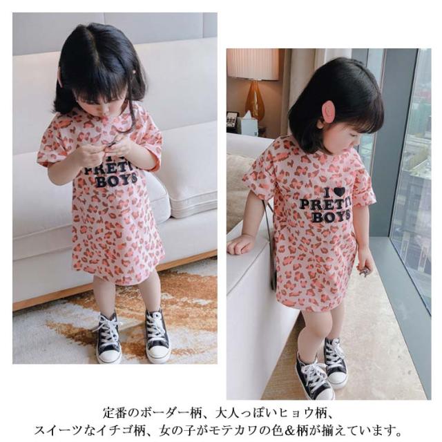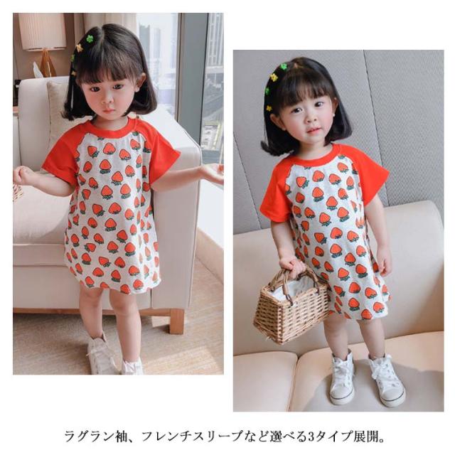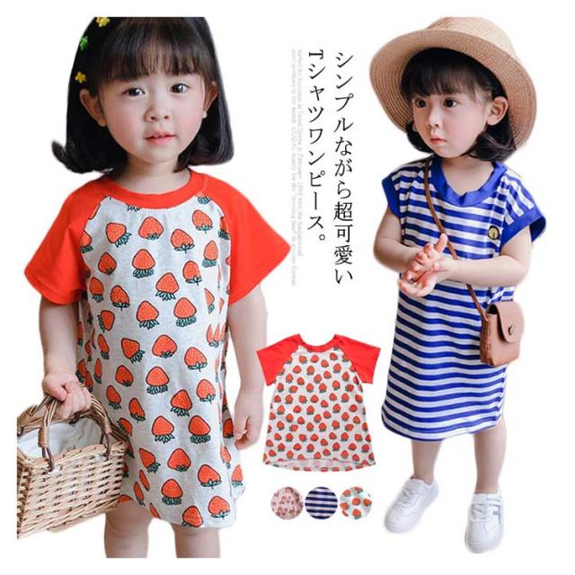 ワンピース ロングTシャツ キッズ 子供服 送料無料 半袖 夏服 可愛い ベビー服 赤ちゃん 綿100% フレンチスリーブ キッズ 女の子 ラグラン袖 ボーダー柄 イチゴ ヒョウ柄