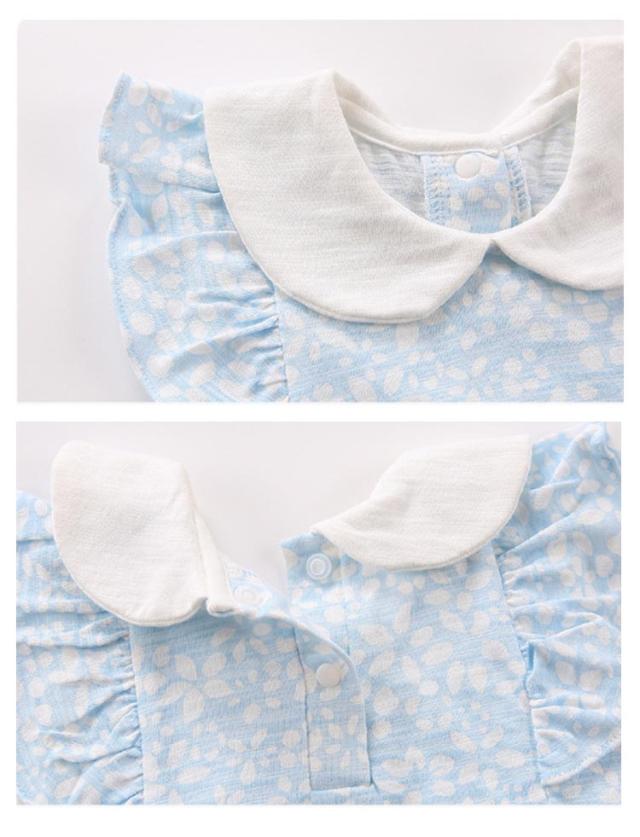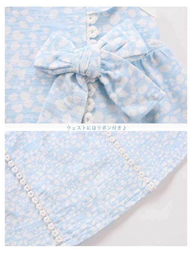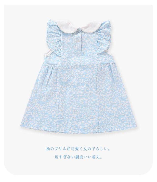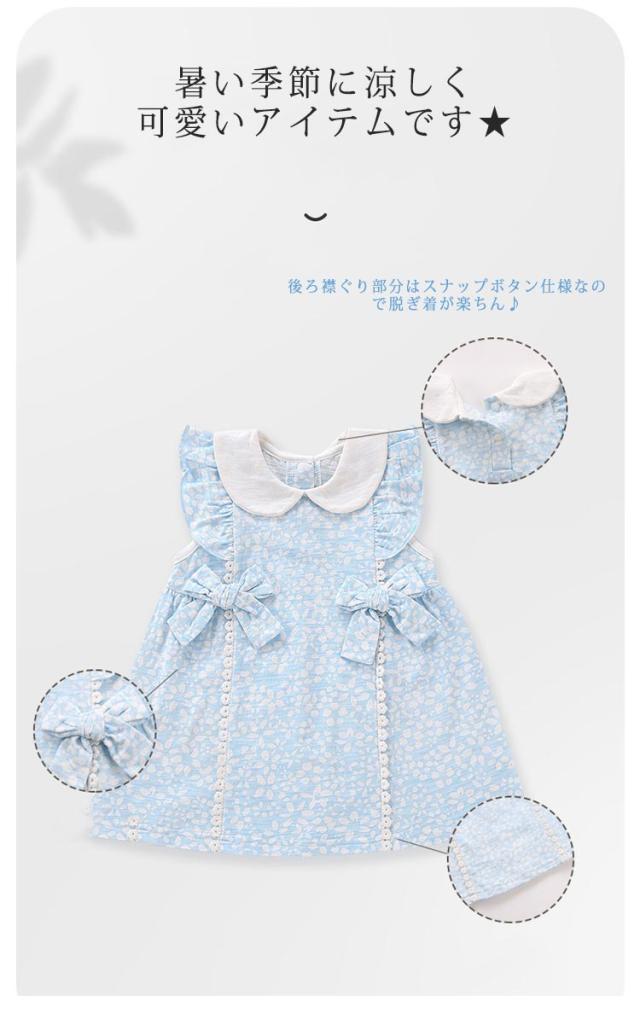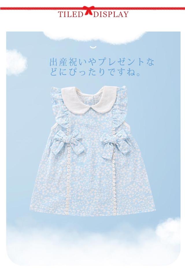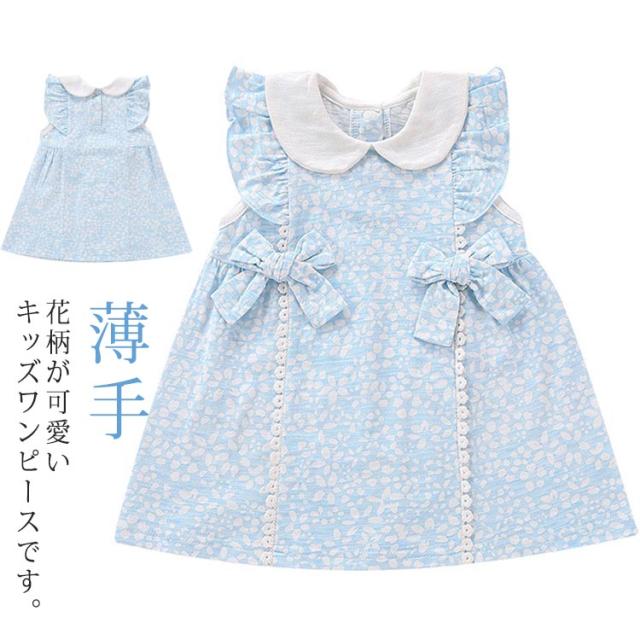 ワンピース 襟付き ノースリーブ 女の子 肩フリル 丸襟 赤ちゃん 子供服 リボン 袖なし 薄手 綿 保育園 幼稚園 通園 通学 カジュアル ガーリー 普段着 お出かけ着 ブルー 花柄