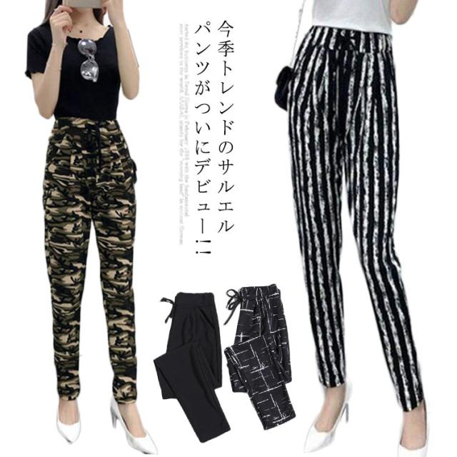 無地・ストライプ・迷彩柄 サルエルパンツ レディース アンクル丈 カジュアルパンツ サルエル パンツ 長ズボン ハイウエスト 薄手 春夏 美脚 ボトムス