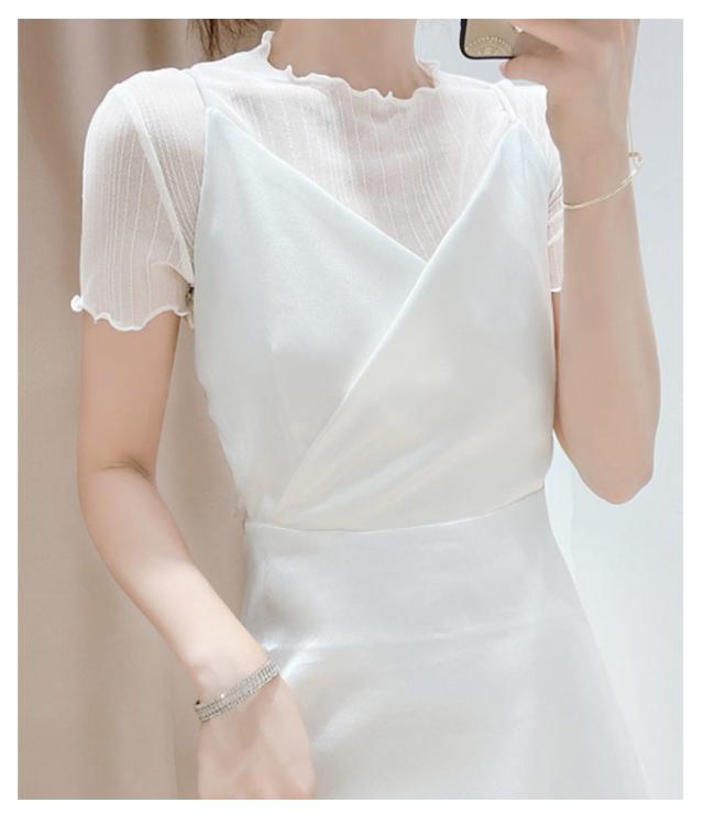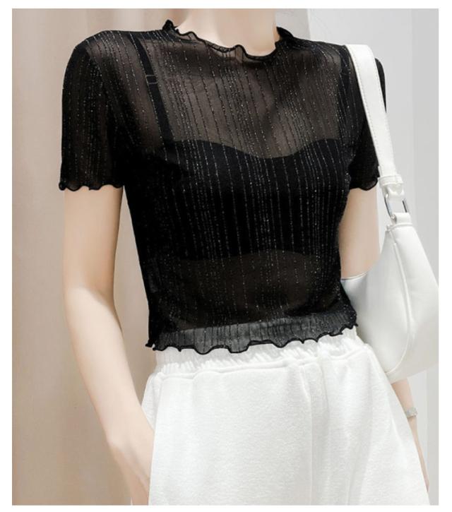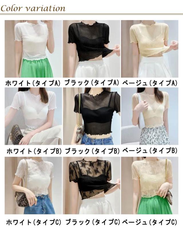 シースルー トップス 半袖 レディース 送料無料 シアートップス シースルー インナー レイヤード tシャツ 重ね着 春夏 透け感 フリルネック 薄手 プルオーバー 上品 肌見せ 無地 柔らかい エレガント ママ 普段着 パーティー