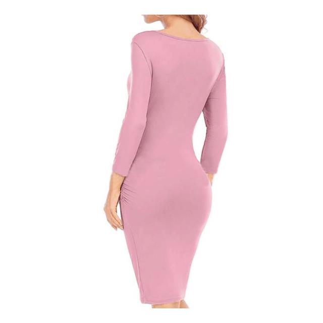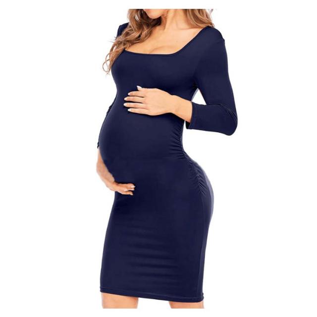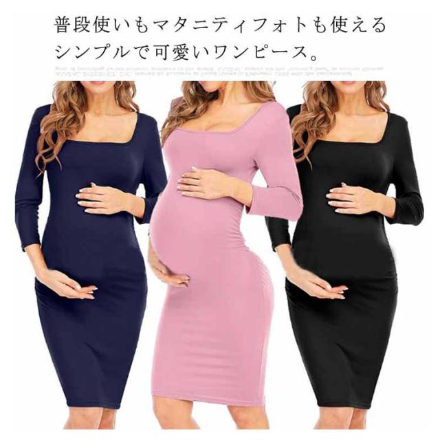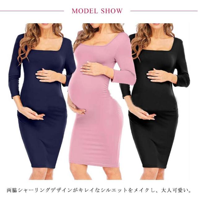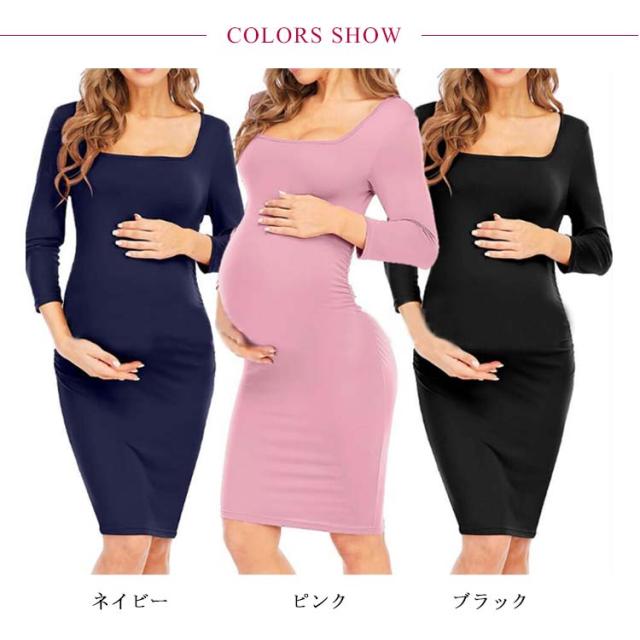 送料無料 マタニティワンピース タイトワンピース 長袖 ワンピース サイドシャーリング ひざ上 スクエア 無地 薄手 インナーワンピース 妊娠服 春夏秋冬 産前産後