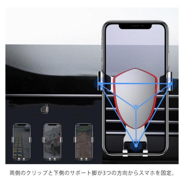 | エアコン吹き出し口に入れるだけで簡単に取り付けられるスマホホルダー! 両側のクリップと下側のサポート脚が3つの方向からスマホを固定。 揺れや衝撃に強く、急ブレーキによる落下を防止します。 スマホと接触する部分はクッション素材を採用しているため、スマートフォン等に傷を付けることは一切ありません。 超強力吸盤付きで、表面が滑らかで平らなところのほとんどにしっかりと吸着します。 スマートフォンケースをお使いの場合でも、安全にしっかりと固定します。 | |