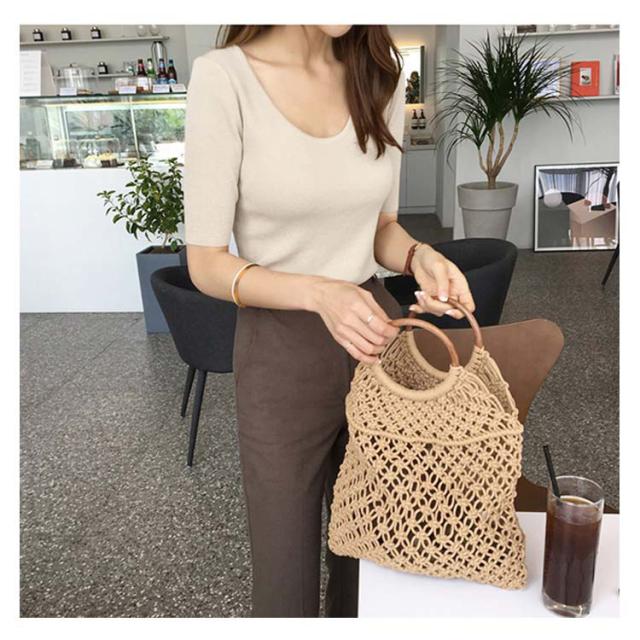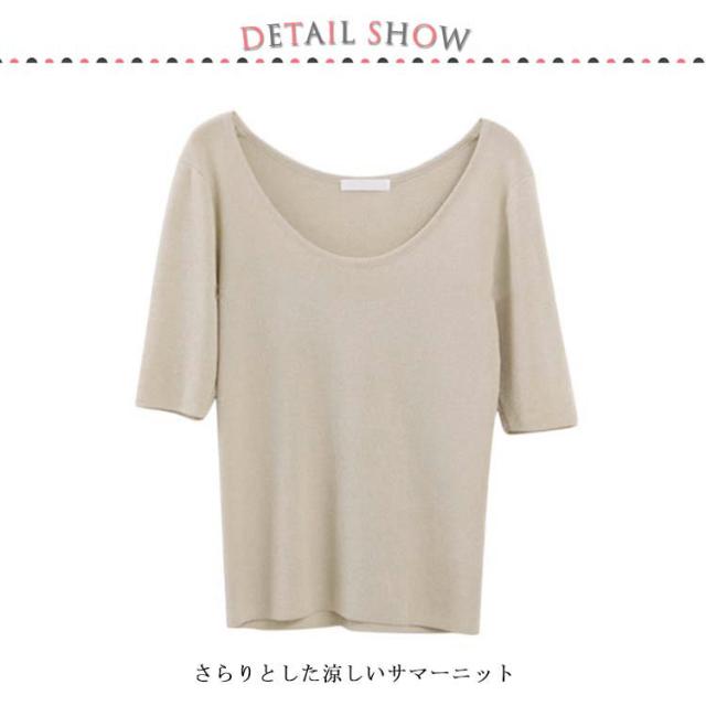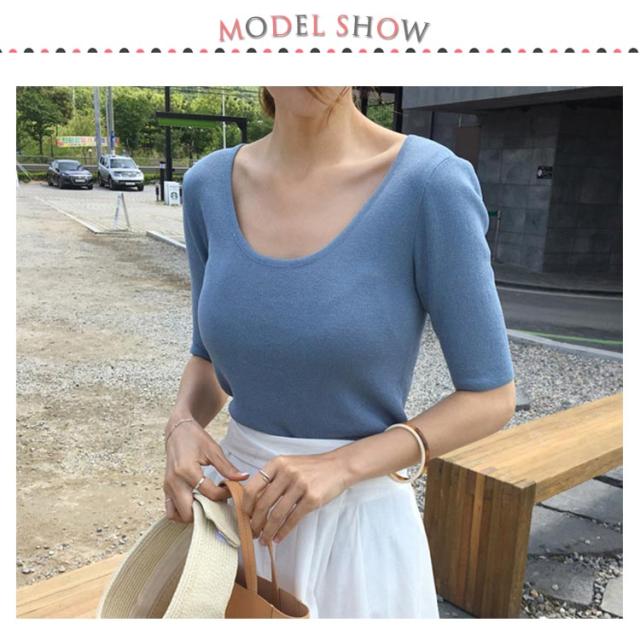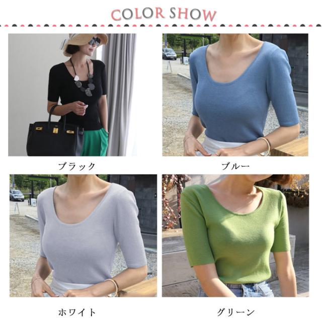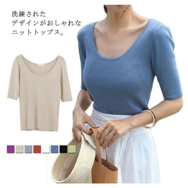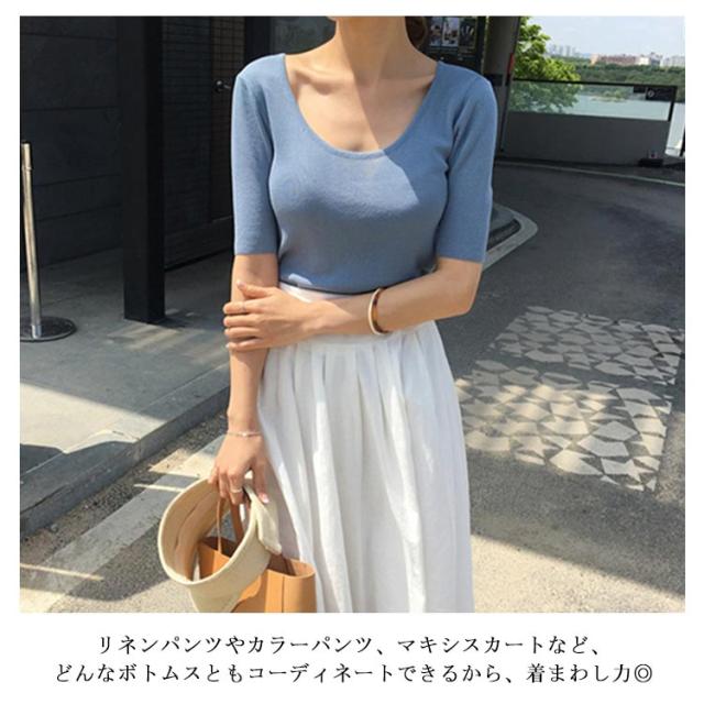 リブニット Tシャツ Uネック サマーニット 清涼 トップス 5分袖 レディース 送料無料 無地 薄手 おしゃれ カットソー ニットトップス 夏服 着痩せ 春秋