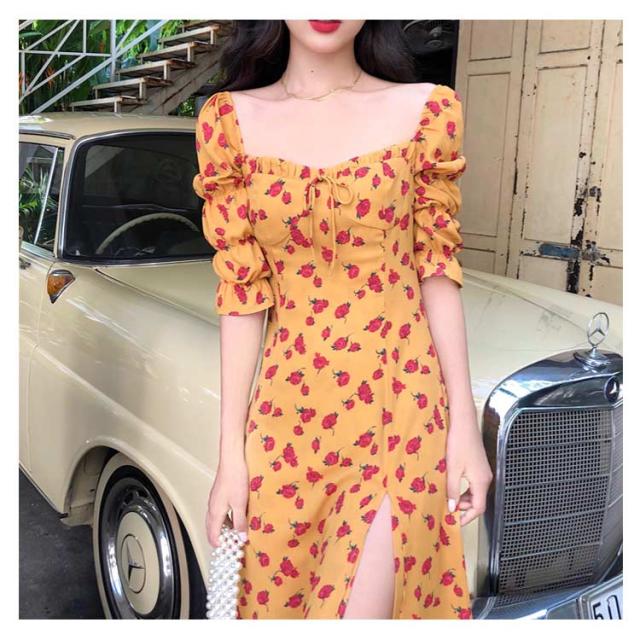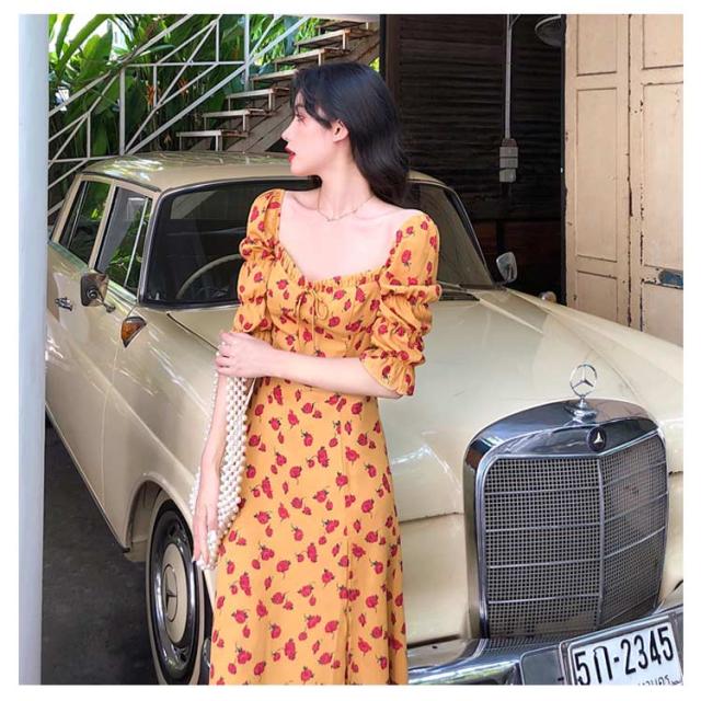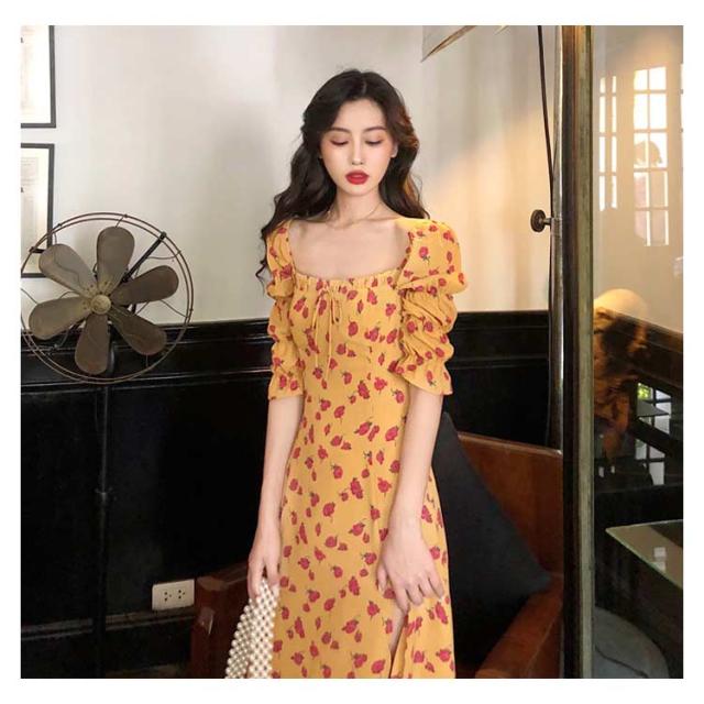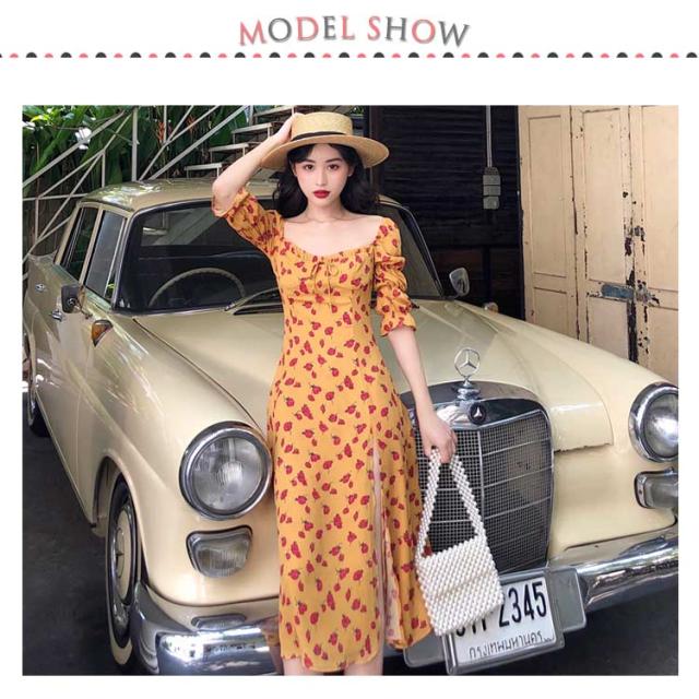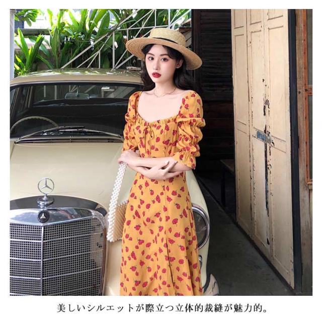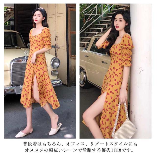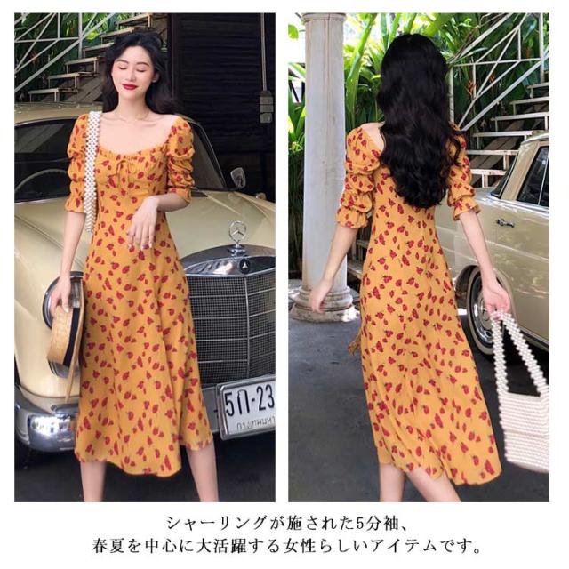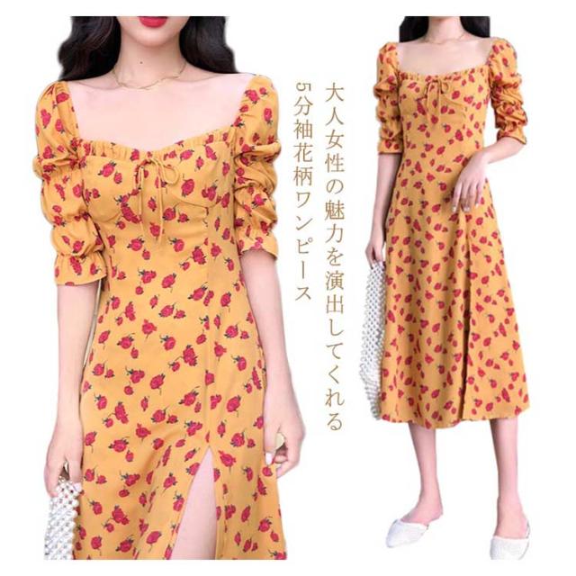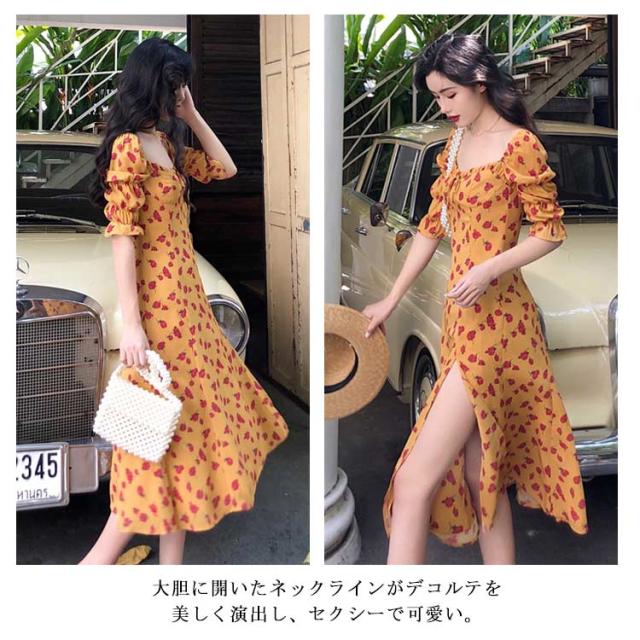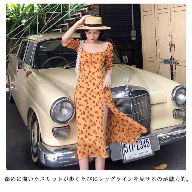 5分袖 ワンピース 花柄 レトロ ヴィンテージ 送料無料 レディース お嬢様 ロングワンピース フレア Aライン 半袖 パフスリーブ オフショルダー スリット ミモレ丈 春夏
