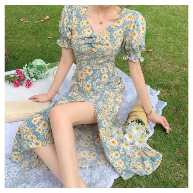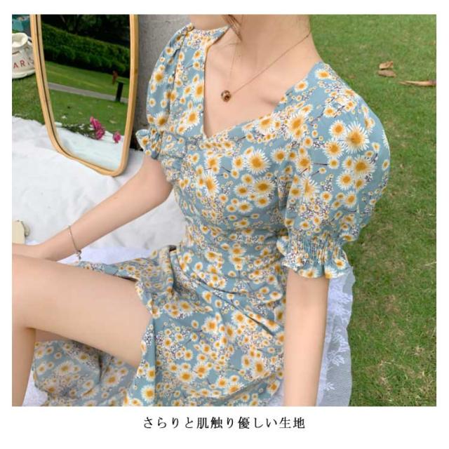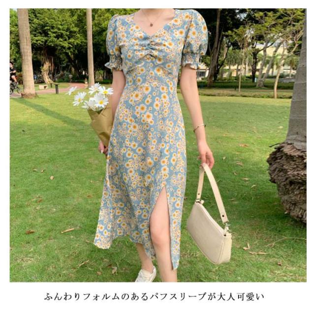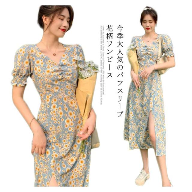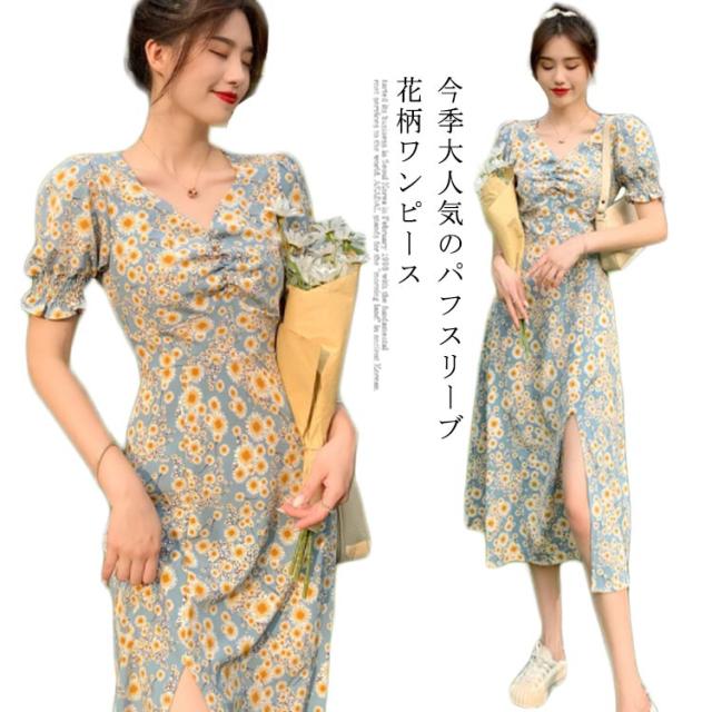 ワンピース 花柄 レトロ 半袖ワンピース 送料無料 レディース ロングワンピース Aライン パフスリーブ スリット入り Vネック ミモレ丈 おしゃれ 夏 通勤 OL お出かけ
