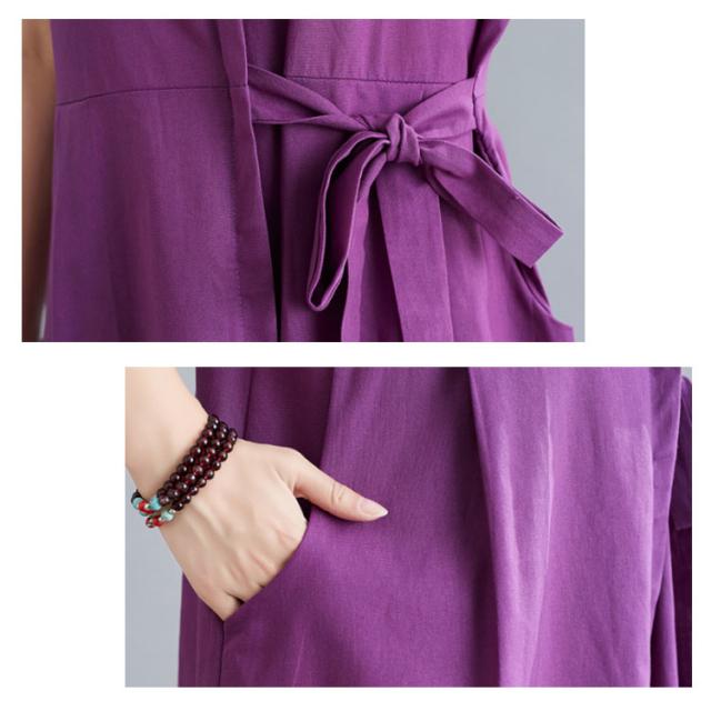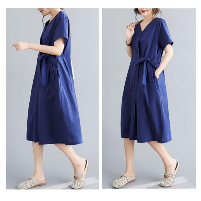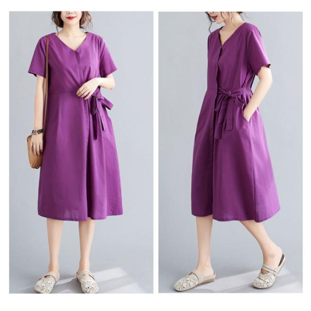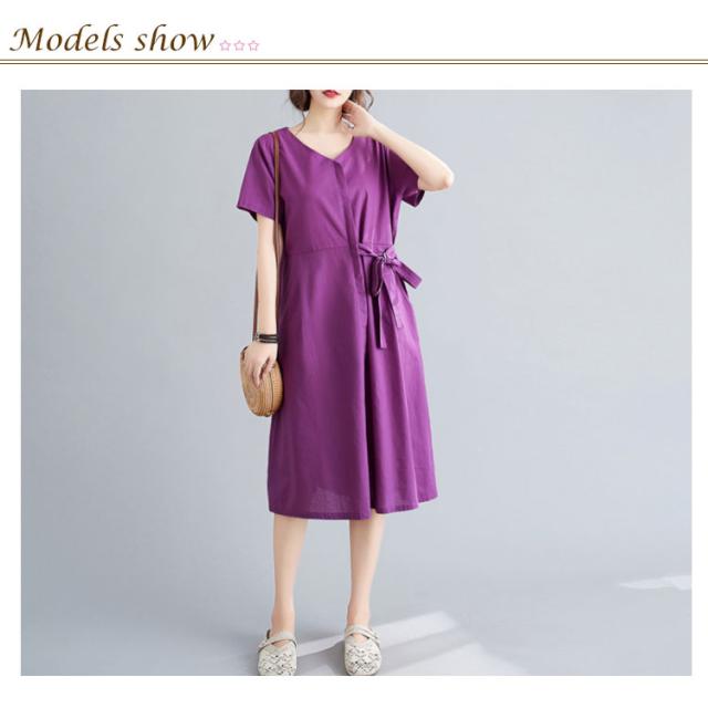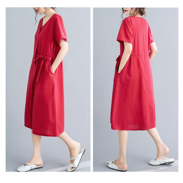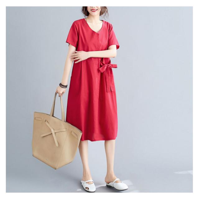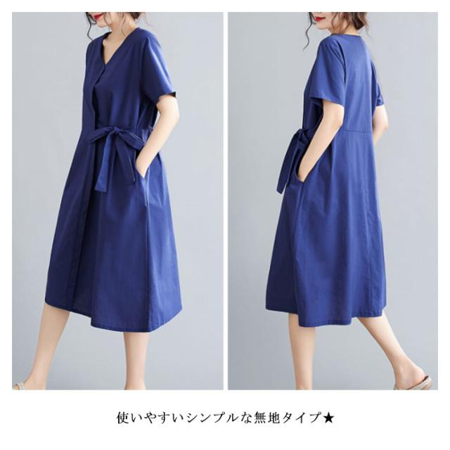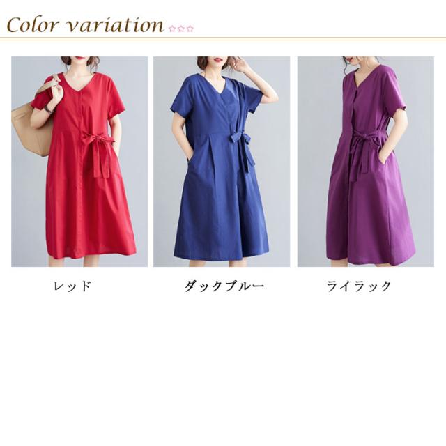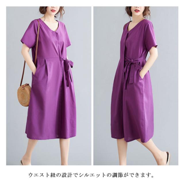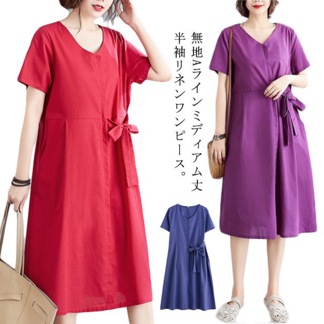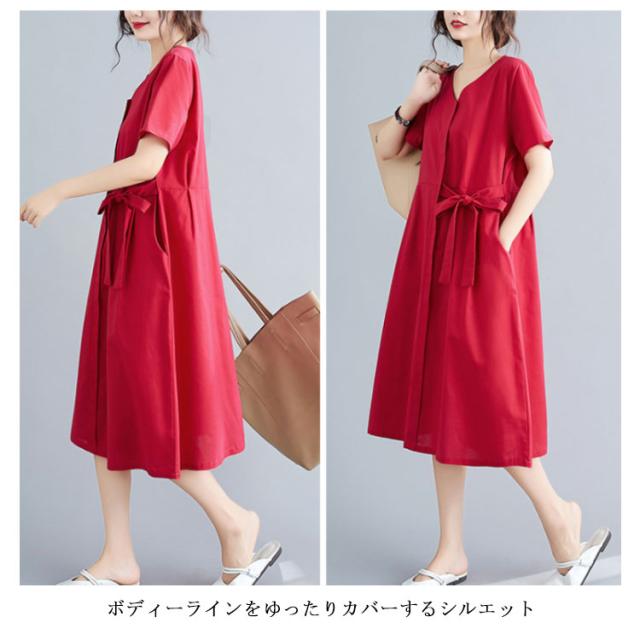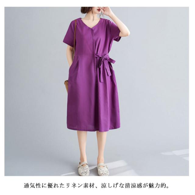 リネンワンピース レディース 大きいサイズ 麻生地 リネン混 半袖 ミディアムワンピース 膝丈ワンピース Vネック 薄手 無地 リボン紐 ゆったり フレアワンピース オーバーサイズ お洒落 カジュアル こなれ感 夏新作 送料無料