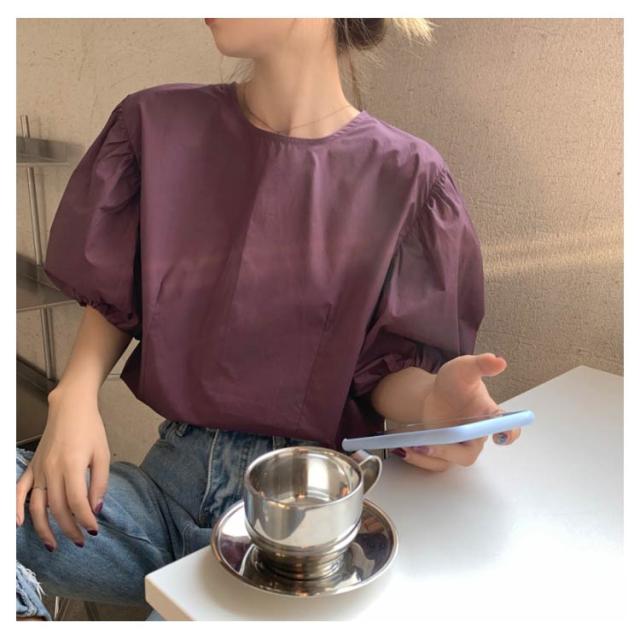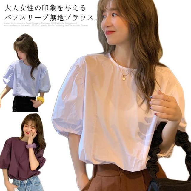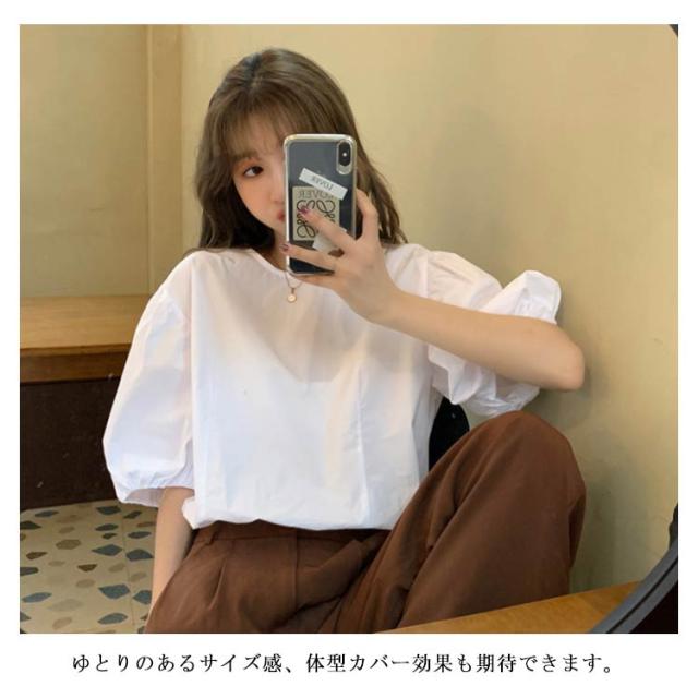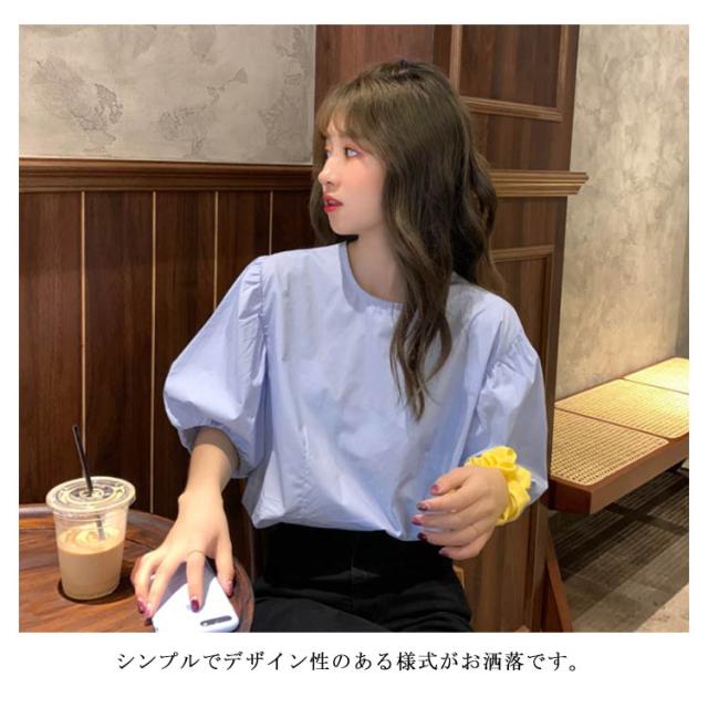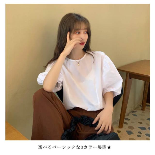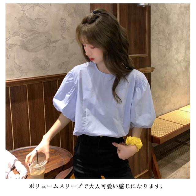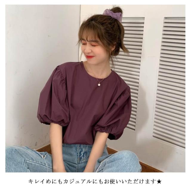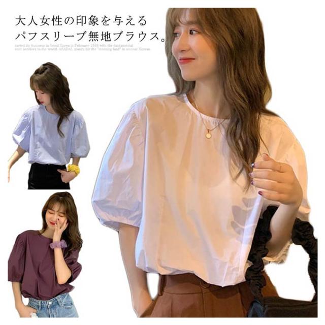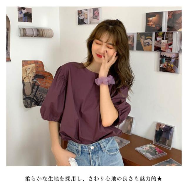 ブラウス レディース シャツ 無地ブラウス ボリュームスリーブ ブラウス パフスリーブ クルーネック 五分袖 ショート丈 ゆったり お洒落 薄手 大人可愛い こなれ感 フェミニン トップス プルオーバー 夏新作 送料無料