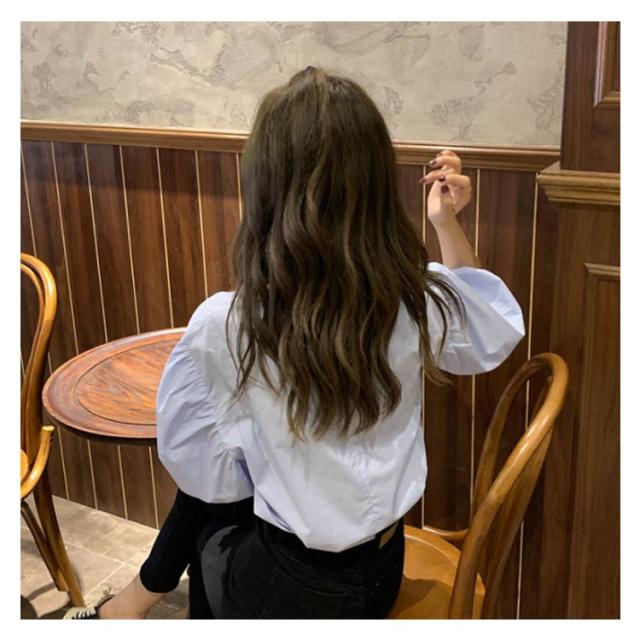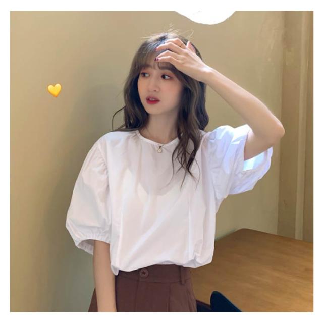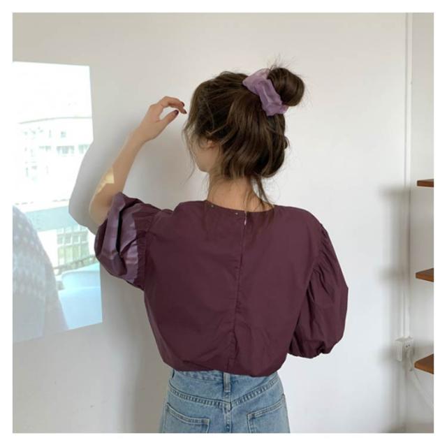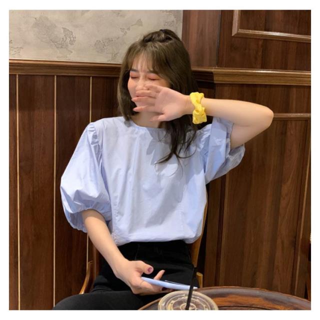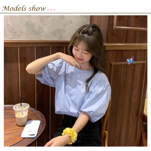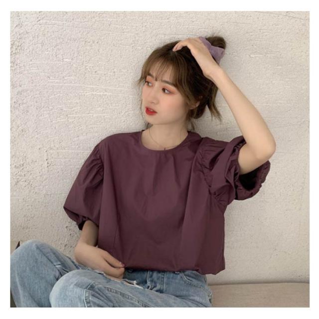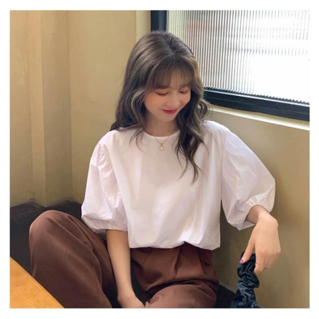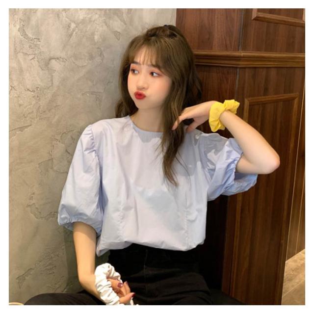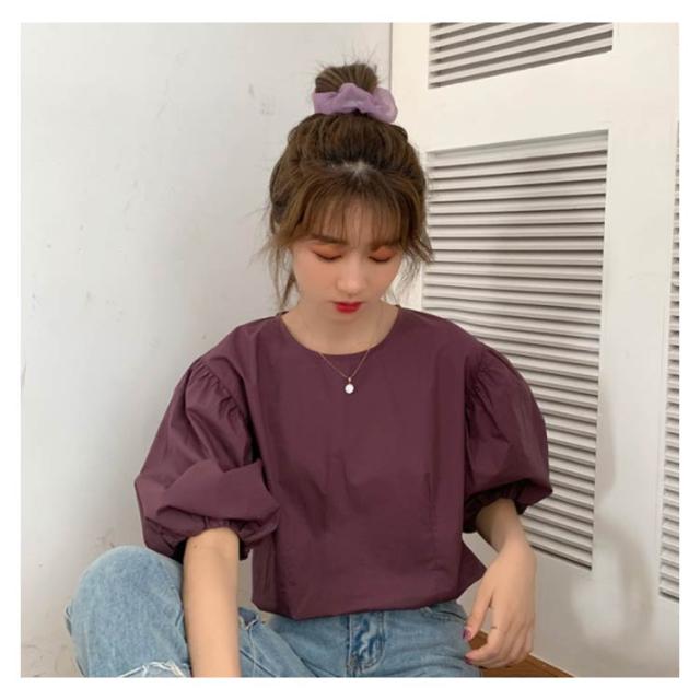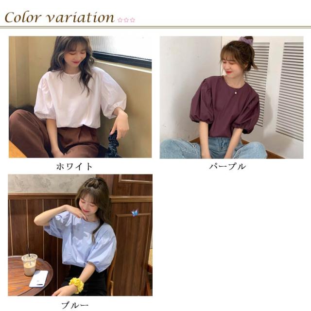 ブラウス レディース シャツ 無地ブラウス ボリュームスリーブ ブラウス パフスリーブ クルーネック 五分袖 ショート丈 ゆったり お洒落 薄手 大人可愛い こなれ感 フェミニン トップス プルオーバー 夏新作 送料無料