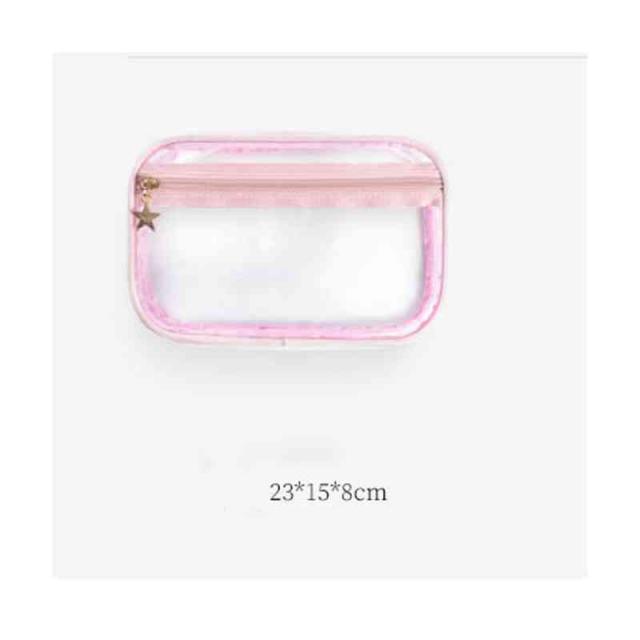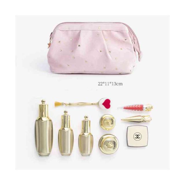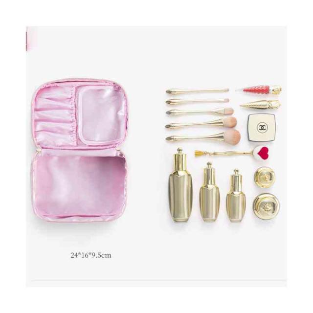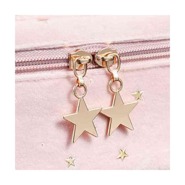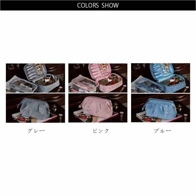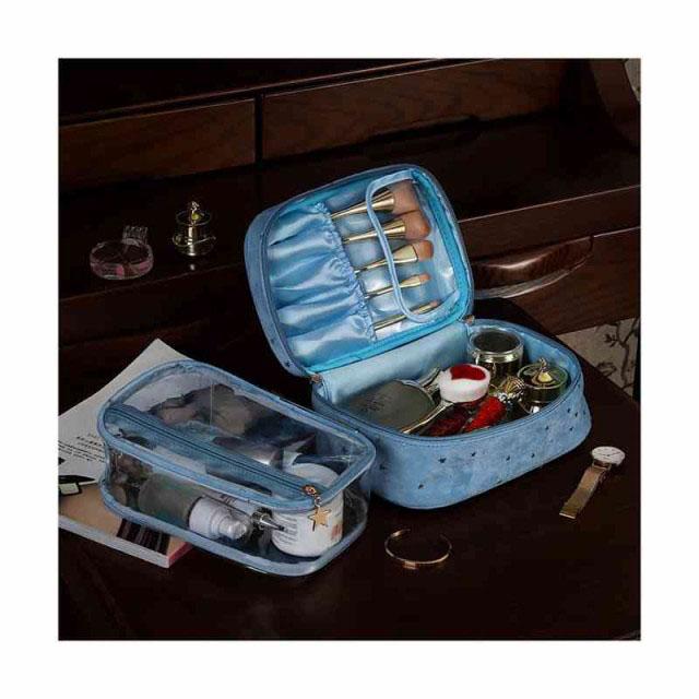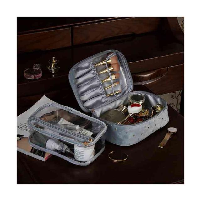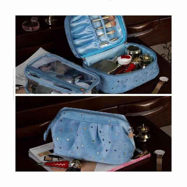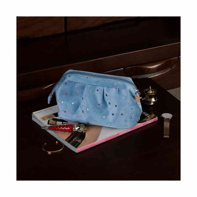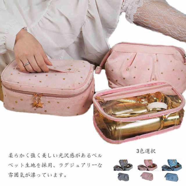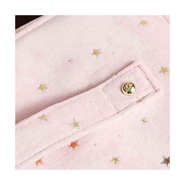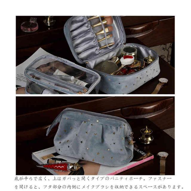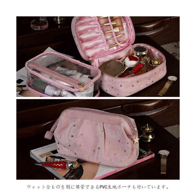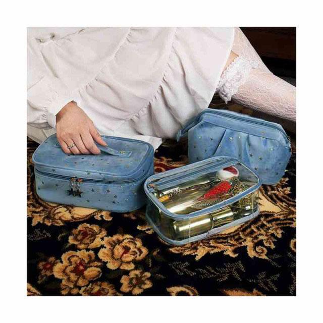 | 柔らかく強く美しい光沢感があるベルベット生地を採用、ラグジュアリーな雰囲気が漂っています。 自宅用はもちらん、出張・旅行など様々なシーンにも愛用されるお得な3点セット。 底が平らで広く、上はガバっと開くタイプのバニティポーチ。ファスナーを開けると、フタ部分の内側にメイクブラシを収納できるスペースがあります。 ウェットなものを別に保管できるPVC生地ポーチも付いています。 キュートな星柄ボディに星型のファスナー引手、アクセントをプラスします。 | |