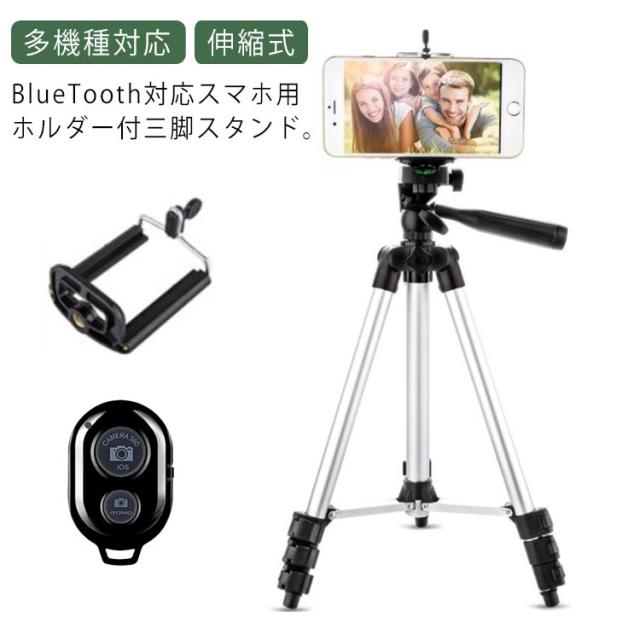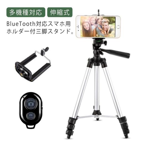 スマホ ホルダー 三脚 スマートフォンホルダー付三脚 スマホホルダー付 自撮り棒 BlueTooth 縦撮影可能自撮り棒 多機種対応 三脚付き 伸縮式 三脚 小型 軽量 コンパクト iPhone対応 Android スポーツカメラ 設定簡単 無線 調整自在 送料無料