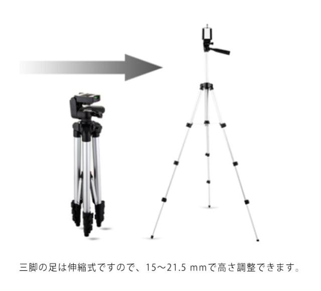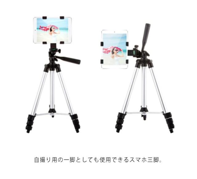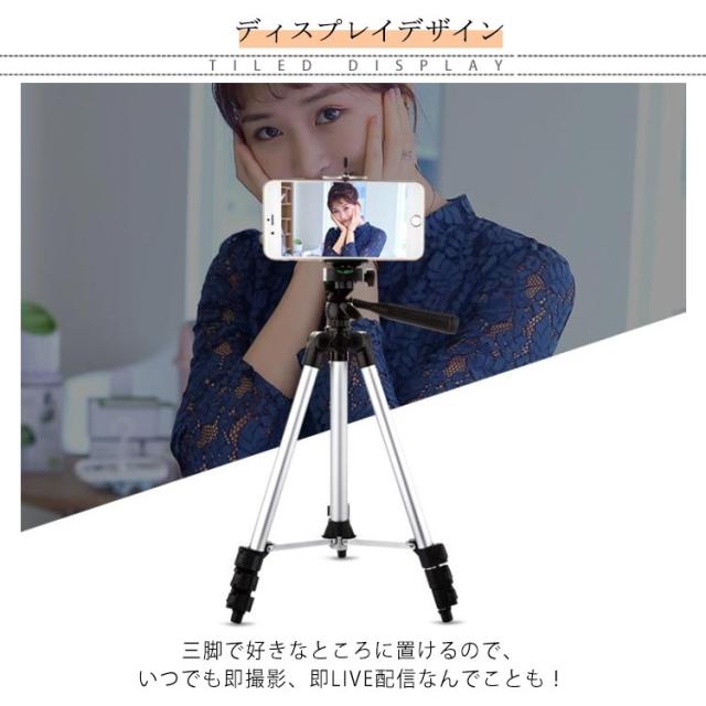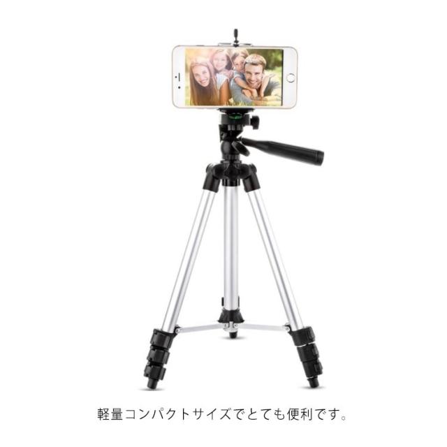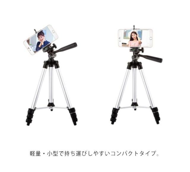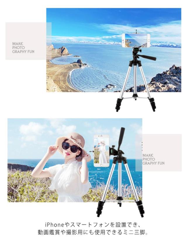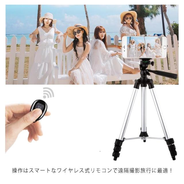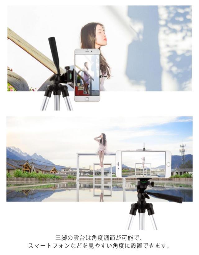 | BlueTooth対応スマホ用ホルダー付三脚スタンド。 三脚で好きなところに置けるので、いつでも即撮影、即LIVE配信なんでことも! 操作はスマートなワイヤレス式リモコンで遠隔撮影旅行に最適! 軽量コンパクトサイズでとても便利です。 三脚の雲台は角度調節が可能で、スマートフォンなどを見やすい角度に設置できます。 三脚の足は伸縮式ですので、15〜21.5 mmで高さ調整できます。 スマホ用ホルダーは取り外しが可能で、取り外した後デジカメラ用として利用可能です。 | |