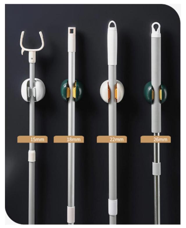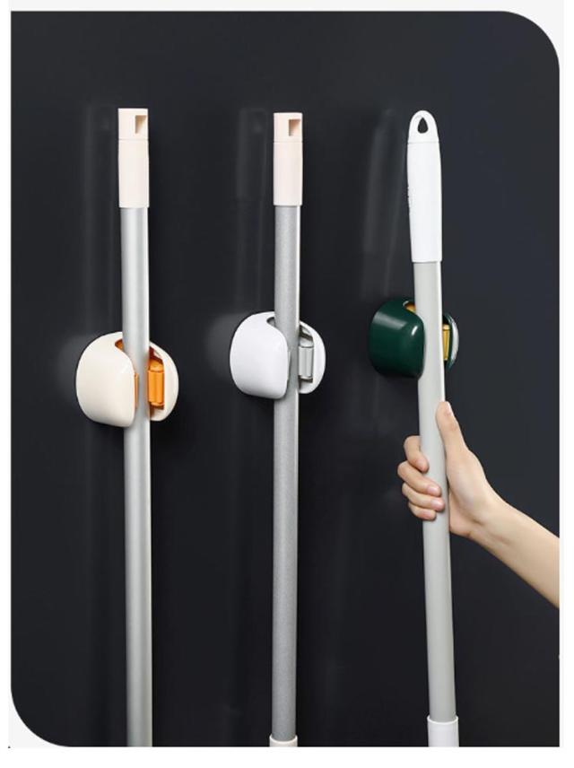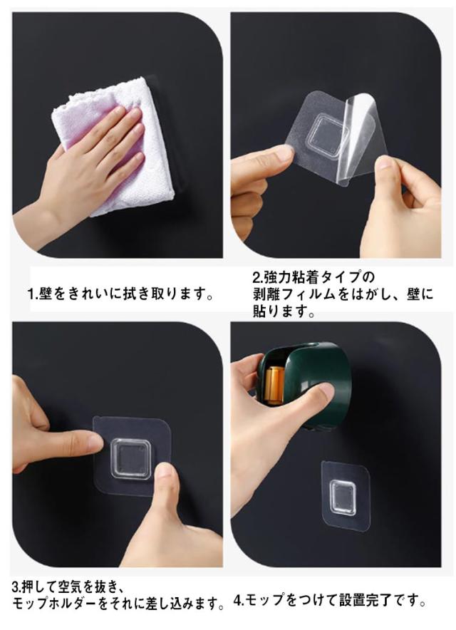 | モップ収納ホルダー3個セット。 リビングスペースを占有するのではなく、壁のスペースを十分に利用可能。 粘着テープで固定するので穴あけ不要。 水に濡れても安心な強力粘着。 | |