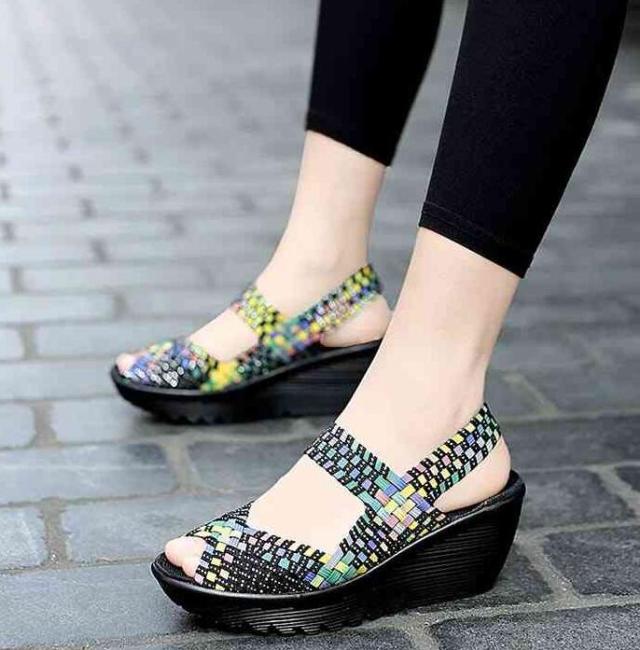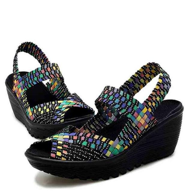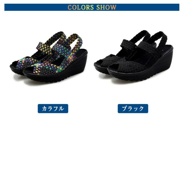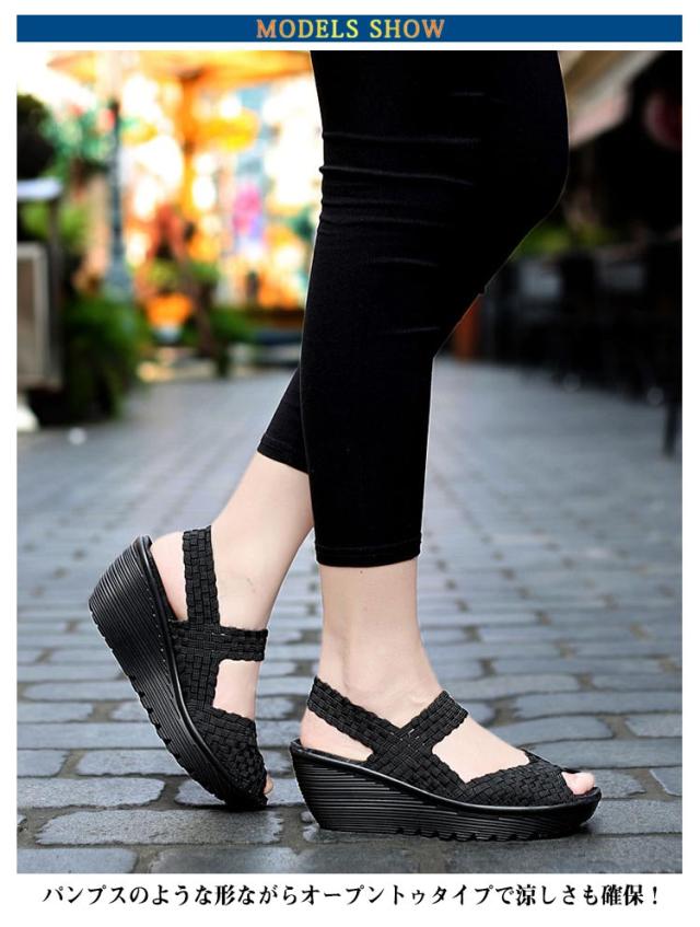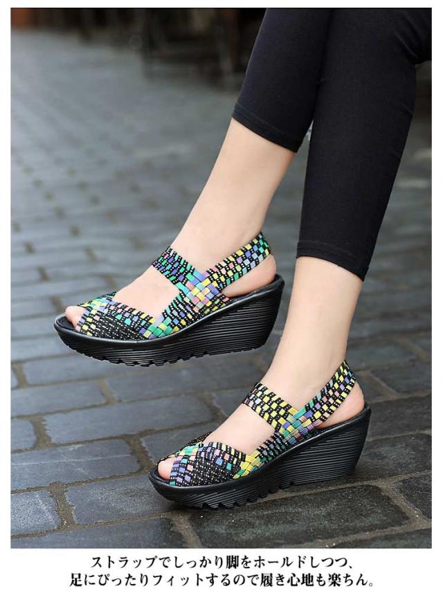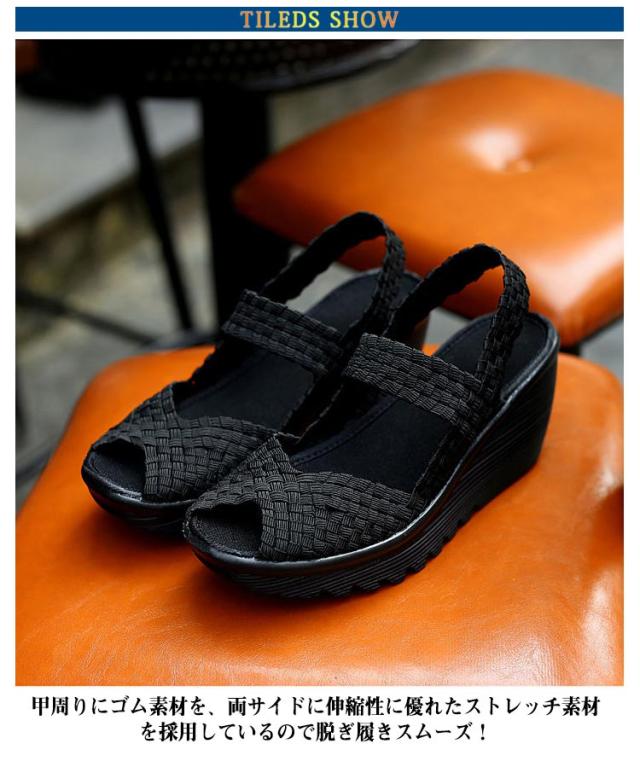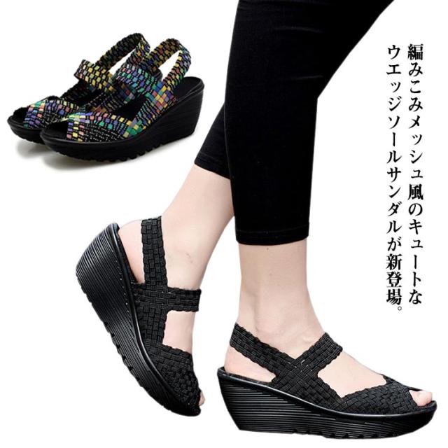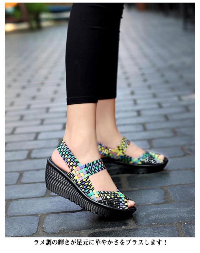 厚底サンダル レディース ウエッジソール サンダル ベルトサンダル ストレッチ オープントゥ ストラップサンダルバックストラップ バックベルトサンダル 編みこみ メッシュ ゴム フィット ラメ オフィスサンダル