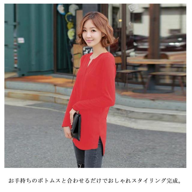 全5色×7サイズ!ロングtシャツ レディース tシャツ ロング丈 ロングT 長袖tシャツ チュニック丈 Vネック スリット 綿 シンプル 無地 春 秋