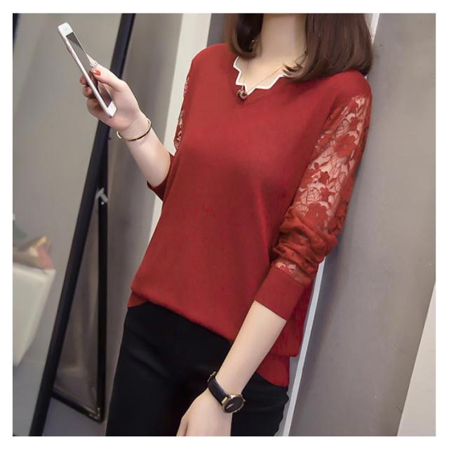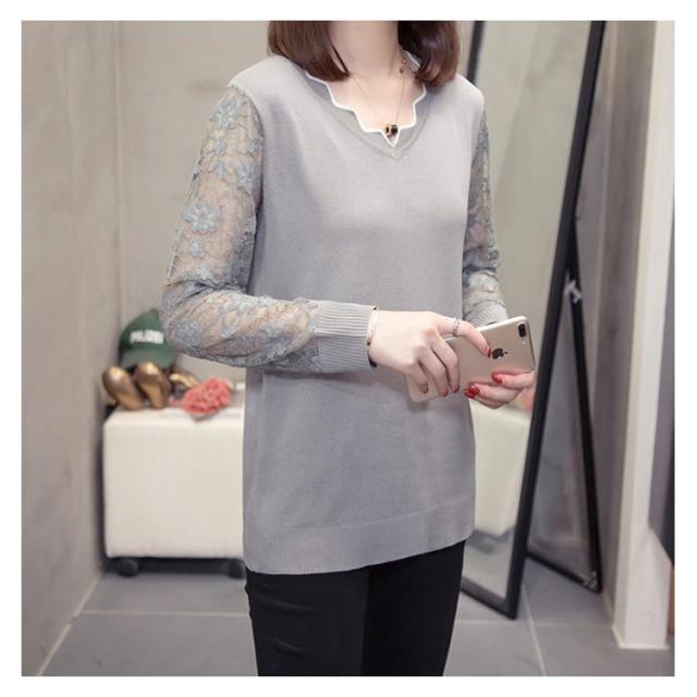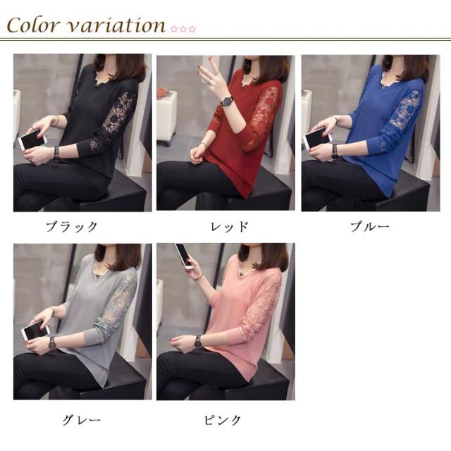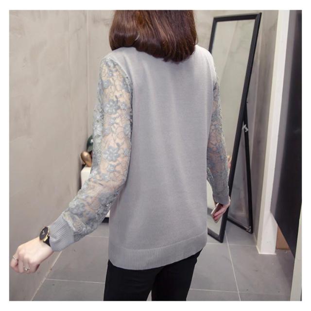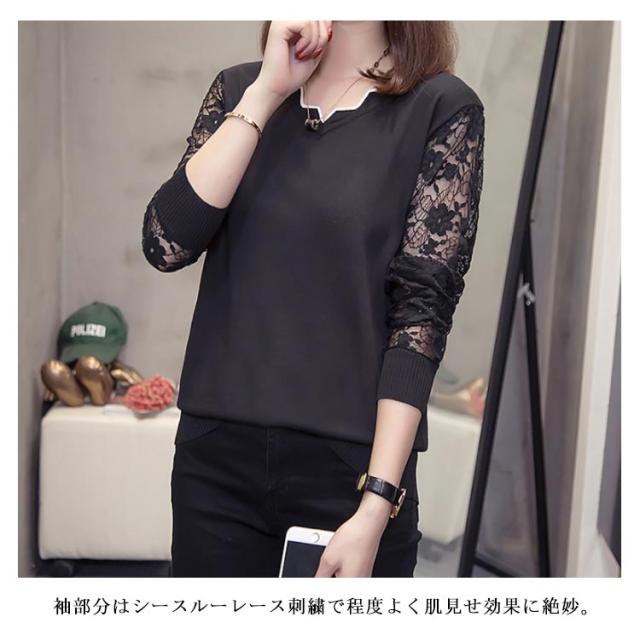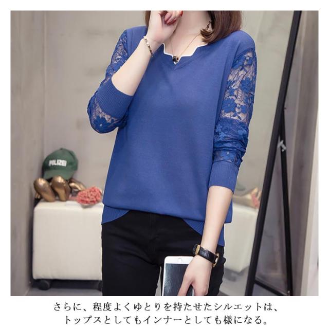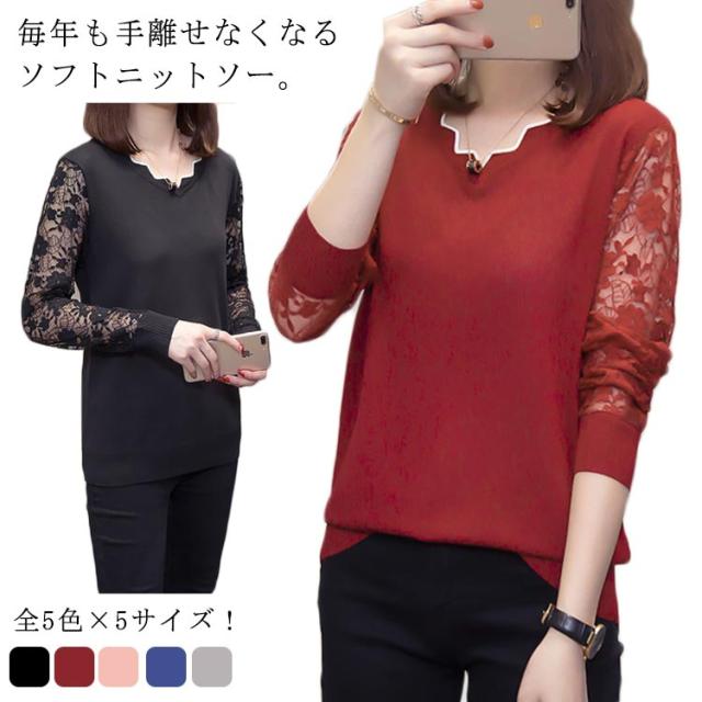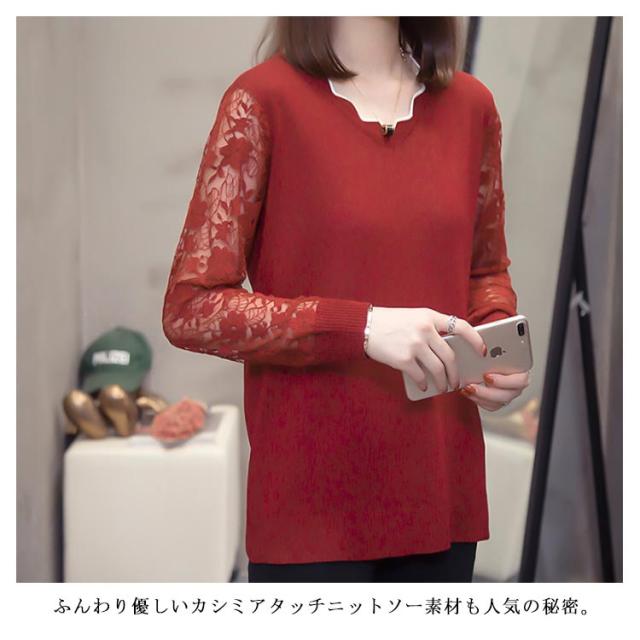 全5色×5サイズ!袖シースルー刺繍 ニットトップス レース袖ニット レディース レース切替 にっと トップス 長袖 大きサイズ 春 秋 おしゃれ 可愛い