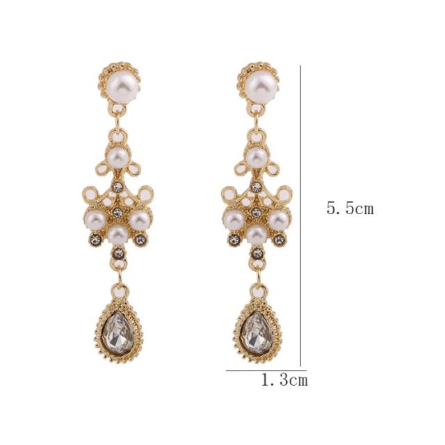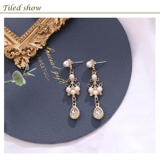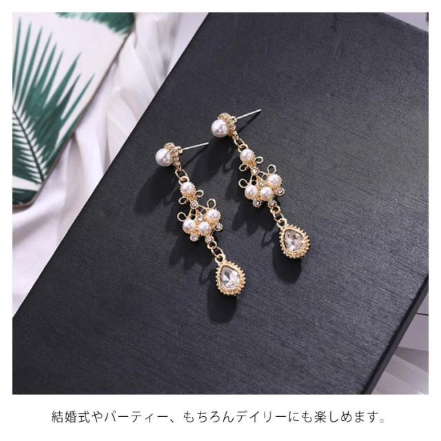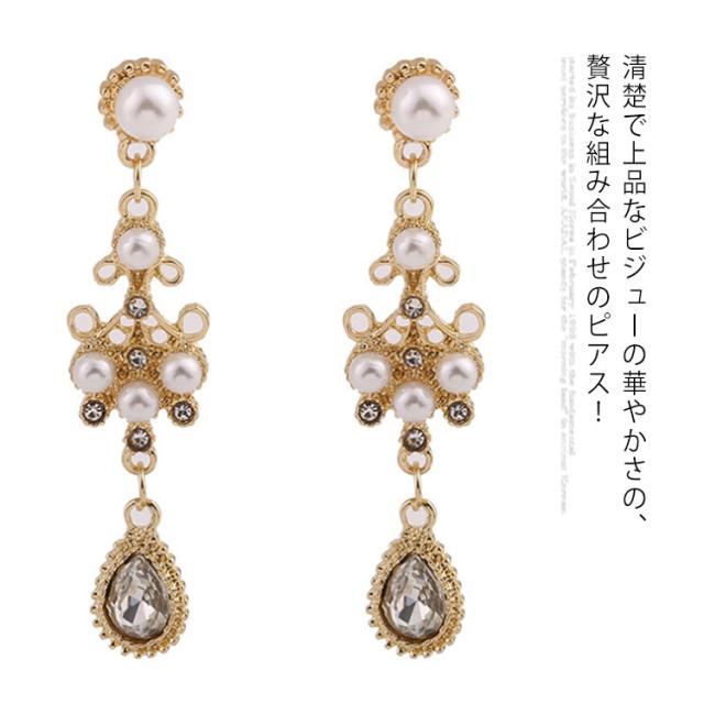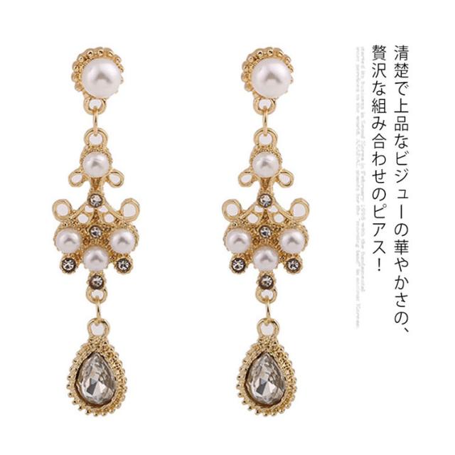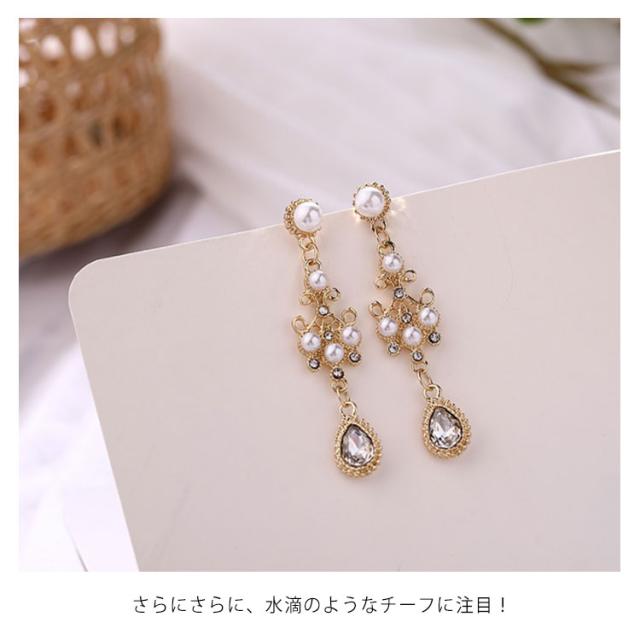 | 清楚で上品なビジューの華やかさの、贅沢な組み合わせのピアス! 立体的でボリューミーなフォルムが可愛らしさ満点♪ さらにさらに、水滴のようなチーフに注目! 結婚式やパーティー、もちろんデイリーにも楽しめます。 | |