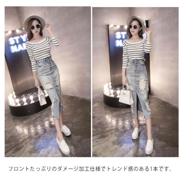 XS−4XLサイズ!フロントスリットダメージ加工 デニムスカート デニムタイトスカート 膝下丈 デニムスカート タイト ペンシル ダメージ クラッシュ スリット入り ハイウエスト 小さいサイズ 大きサイズ スカート デニム 春夏