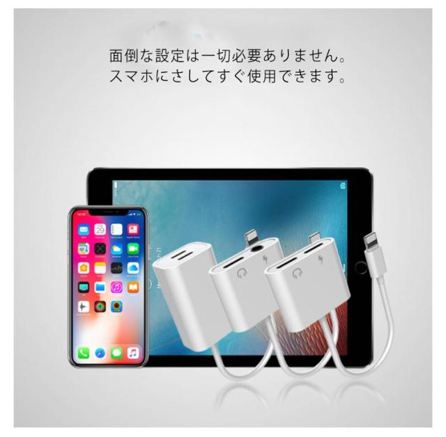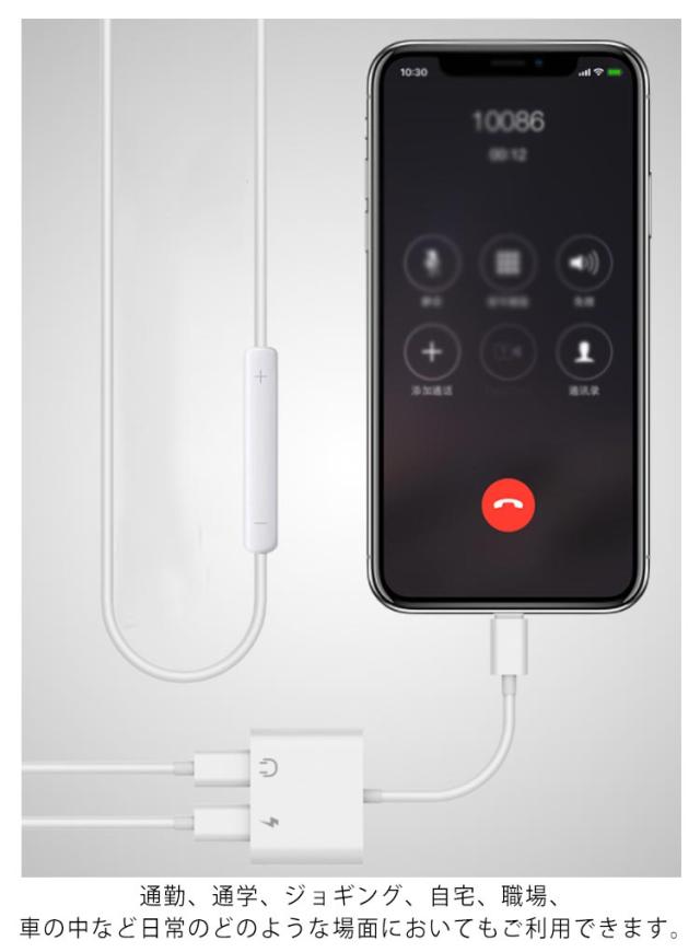 | 2in1 iPhoneイヤホン交換アダプター 充電.通話.音楽鑑賞.リモコン 充電しながら、通話、音楽再生を楽しめます。 イヤホンのリモコンの再生/一時停止/曲送り/曲戻りの及び通話などすべての操作が対応できます。 高品質音声処理チップが内蔵され、音声の損失を最小まで抑えて、 高音質な音楽を楽しめることができます。 最大出力2Aの仕様で、効率高くて充電時間を短縮します。 面倒な設定は一切必要ありません。スマホにさしてすぐ使用できます。 | |