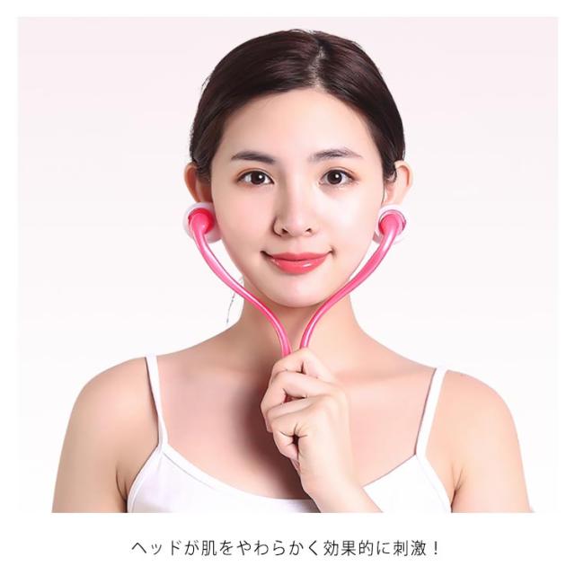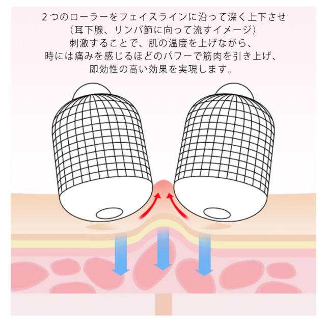 | 自宅でフェイシャルエステ。 コロコロ転がしてスッキリフェイスに♪ 2つのローラーをフェイスラインに沿って深く上下させ(耳下腺、リンパ節に向って流すイメージ)刺激することで、肌の温度を上げながら、時には痛みを感じるほどのパワーで筋肉を引き上げ、即効性の高い効果を実現します。 一日約5〜10分の簡単コロコロマッサージで素肌をキュッと引き締めてお肌イキイキシェイプアップ! ヘッドが肌をやわらかく効果的に刺激! ! | |