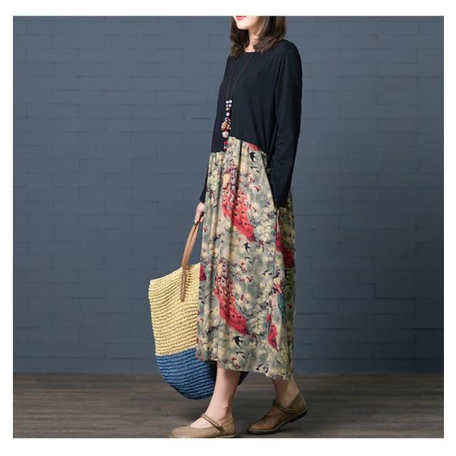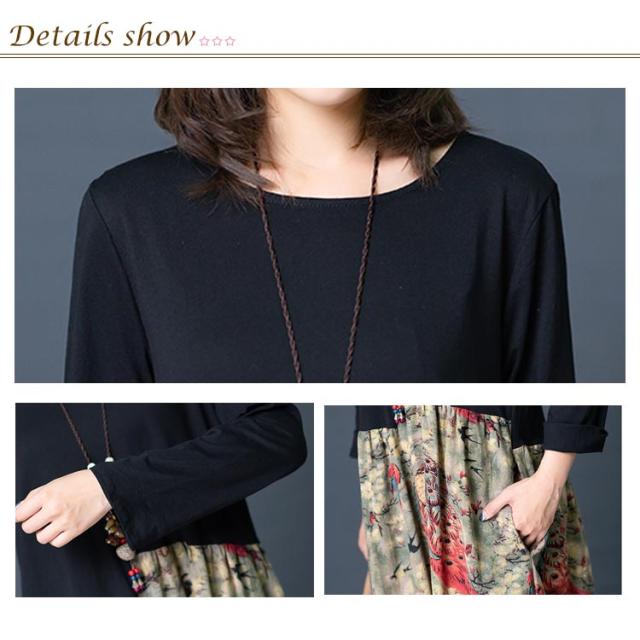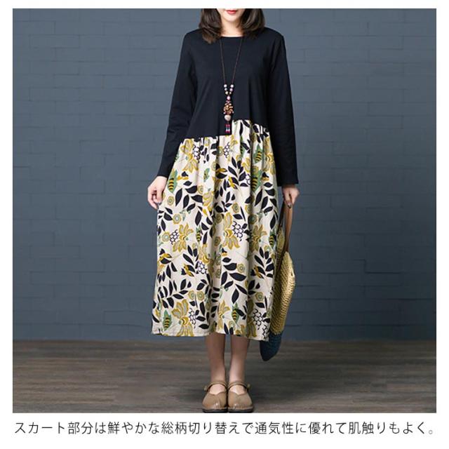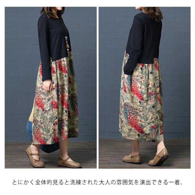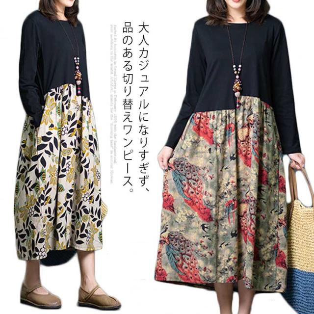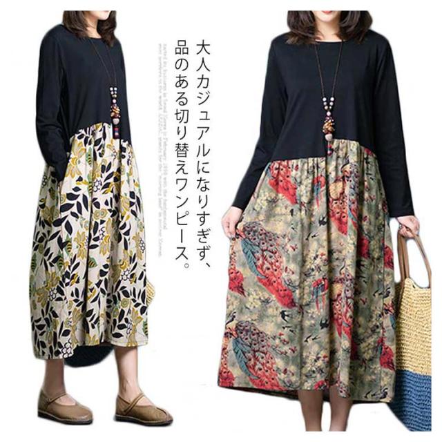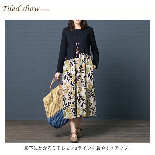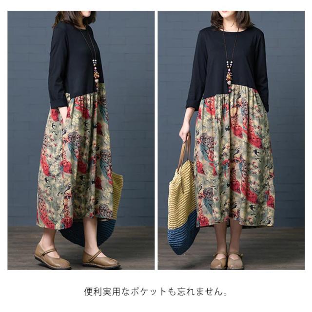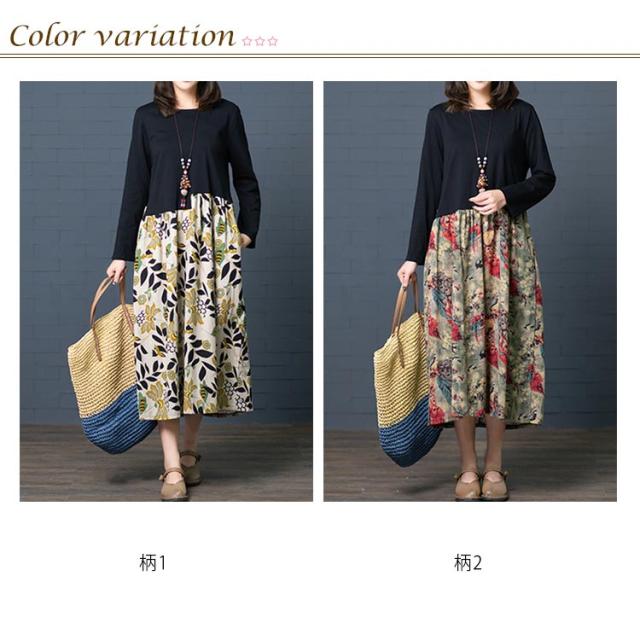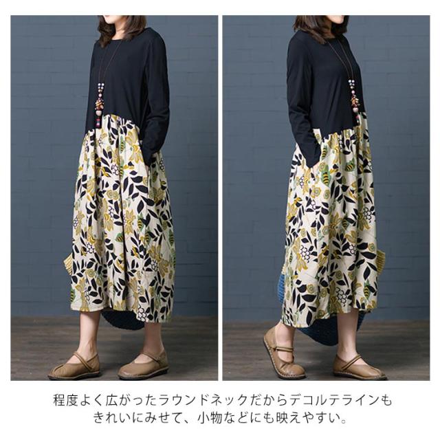 2020秋新作 ワンピース 大きサイズ 綿麻ワンピース プリント切り替え 長袖ワンピース アシメトリー 膝下丈 カジュアルワンピース 綿麻 麻混 ラウンドネック 春 秋