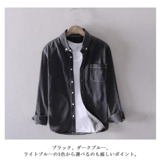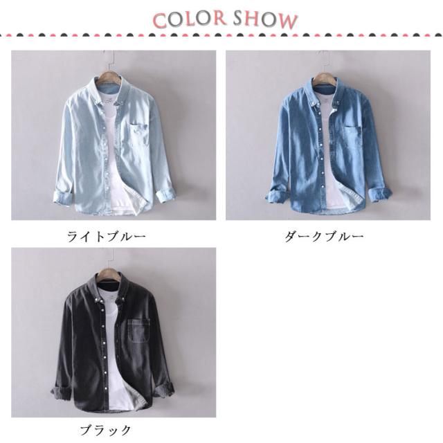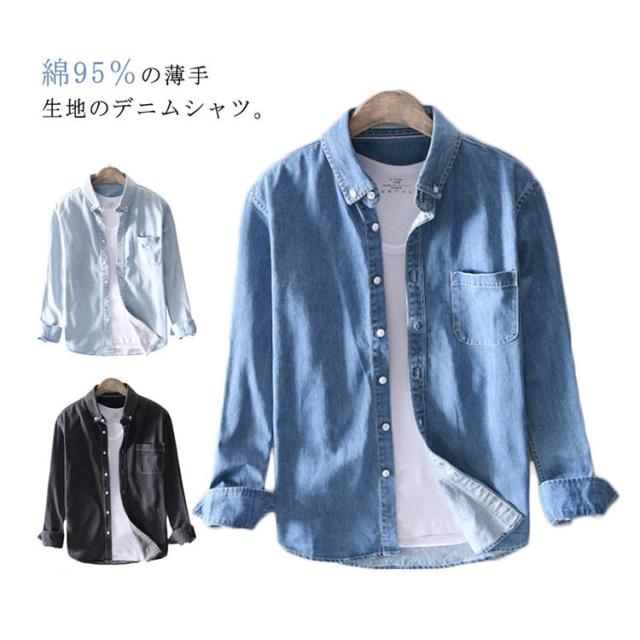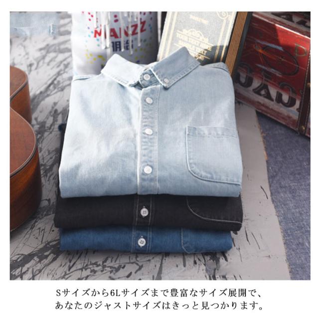 | 綿95%の薄手生地のデニムシャツ。 サラっとした優しい肌触りで春、夏、秋、冬のオールシーズンご着用いただけるから重宝します。 ビンテージ感ある風合いが1枚でもお洒落なデニムシャツ。 無駄な装飾を省いたシンプルデザインで、ストリート、カジュアルなど幅広いスタイリングに使える合わせやすい1枚です。 Sサイズから6Lサイズまで豊富なサイズ展開で、あなたのジャストサイズはきっと見つかります。 ブラック、ダークブルー、ライトブルーの3色から選べるのも嬉しいポイント。 | |