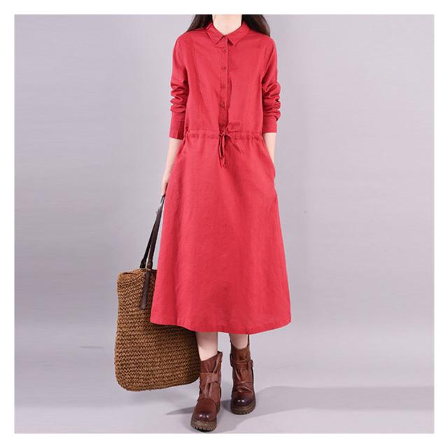 全3色×5サイズ!大きサイズ ワンピース 長袖 綿麻ワンピース 春ワンピース コットンリネン カジュアルワンピース 長袖ワンピース ロング丈 ゆったり aライン 襟付き シンプル 無地 春秋