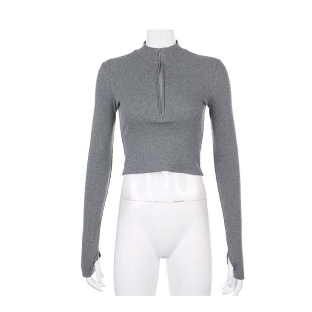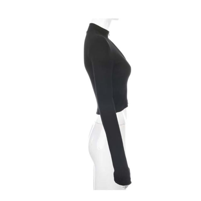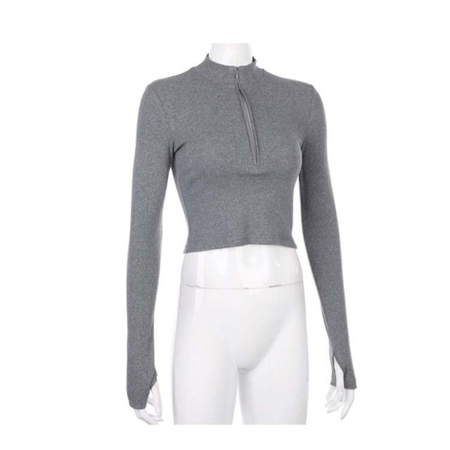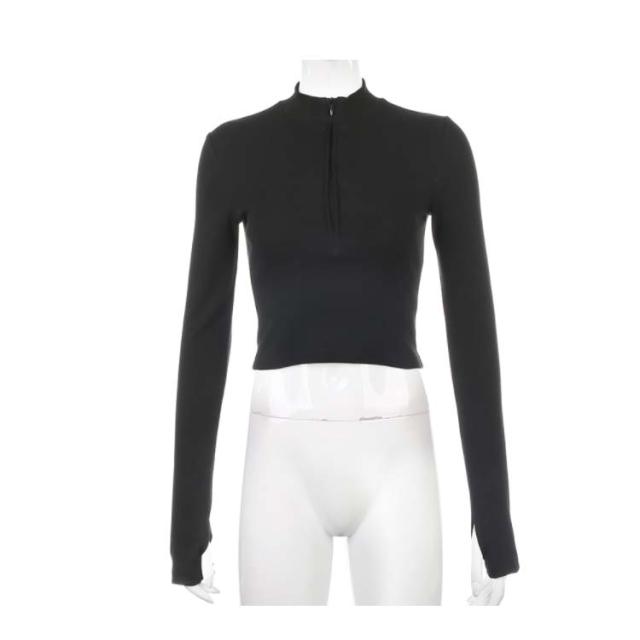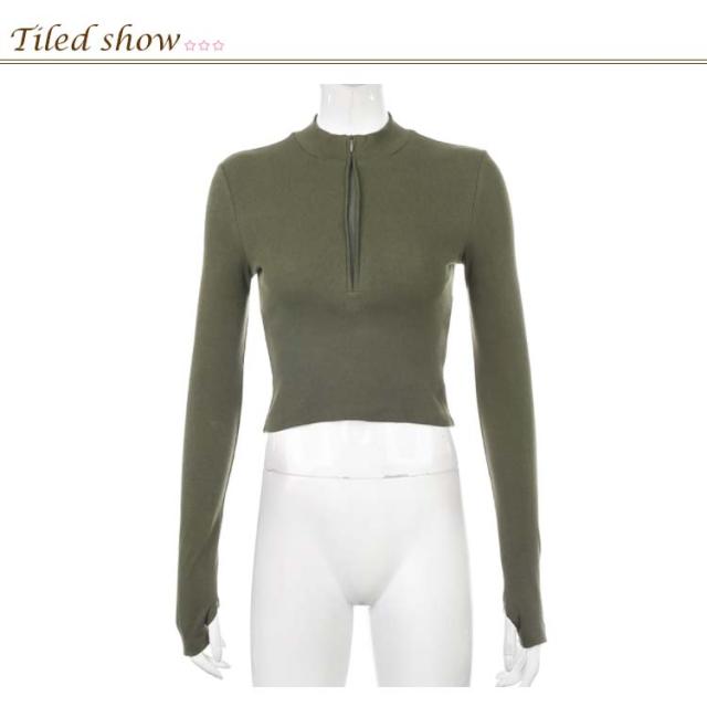 全4色×3サイズ!指穴付き ニットソー フロントジッパー ハイネックtシャツ ハイネック tシャツ ショート丈 ハイウエスト トップス リブ おしゃれ 無地 運動用 タイト