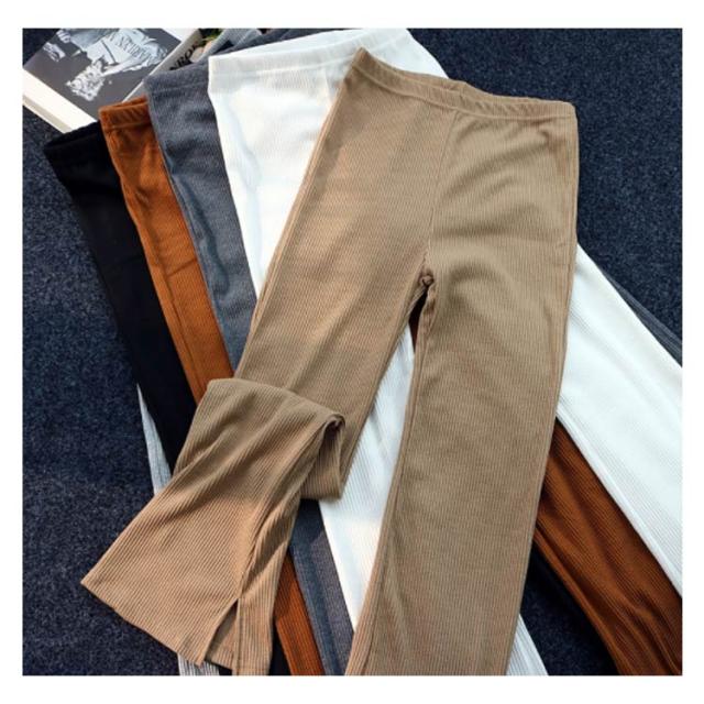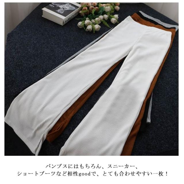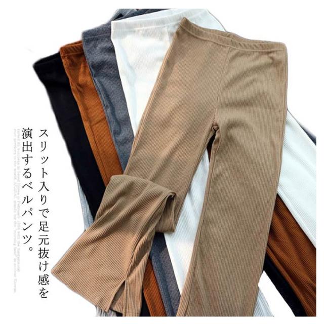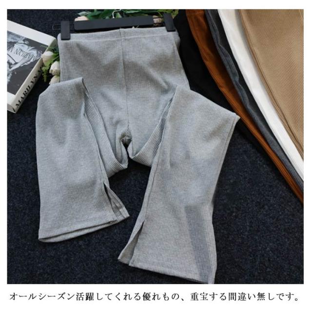 全6色 リブニット スリット パンツ ニットソー ロングパンツ フレアパンツ 送料無料 レディース ウェストゴム ストレッチ イージーパンツ ベルボトム 無地