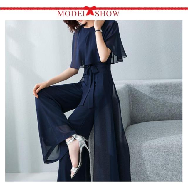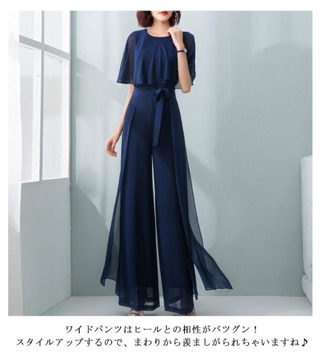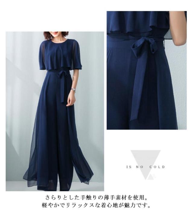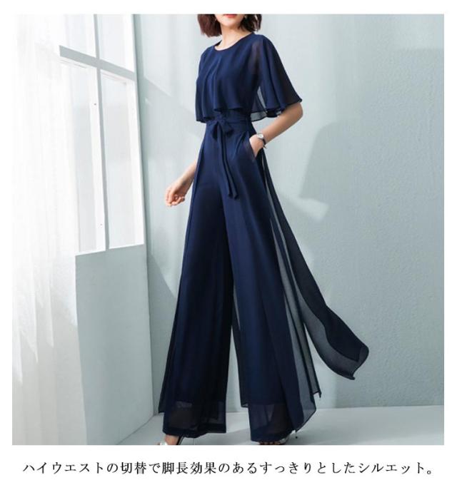 レディース ジャンプスーツ オールインワン ロングパンツ パンツドレス バックジッパー 袖あり 脚長効果 ハイウェスト ネイビー パーティードレス 結婚式 オフィスカジュアル OL 通勤 きれいめ 上品 食事会 同窓会 お呼ばれ 二次会 パーティー おしゃれ