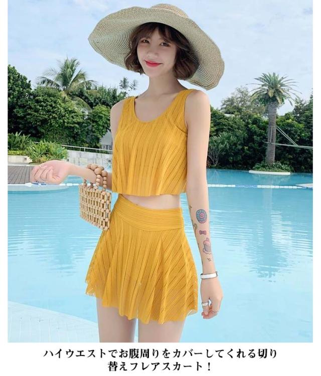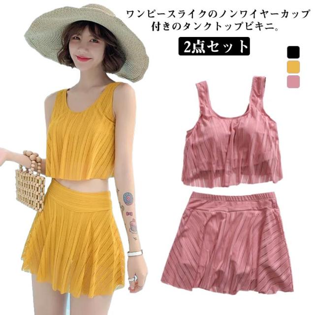 送料無料 水着 レディース タンキニ 水着 タンクトップ ビキニ 水着 スカート 2点セット セパレート フリルビキニ ストライプ柄 パッド付き 小胸 バスト 盛れる お洒落 モノトーン 露出控えめ フリル 可愛い セクシー 海 プール