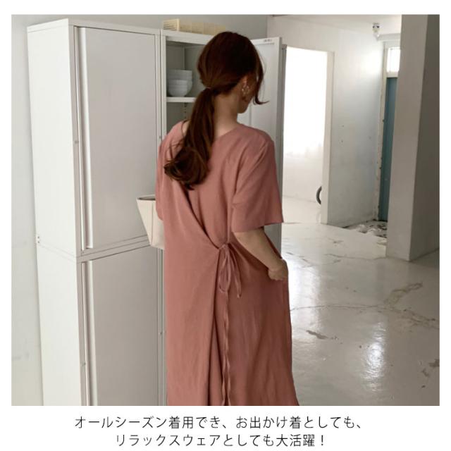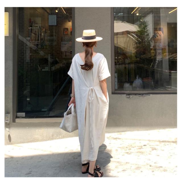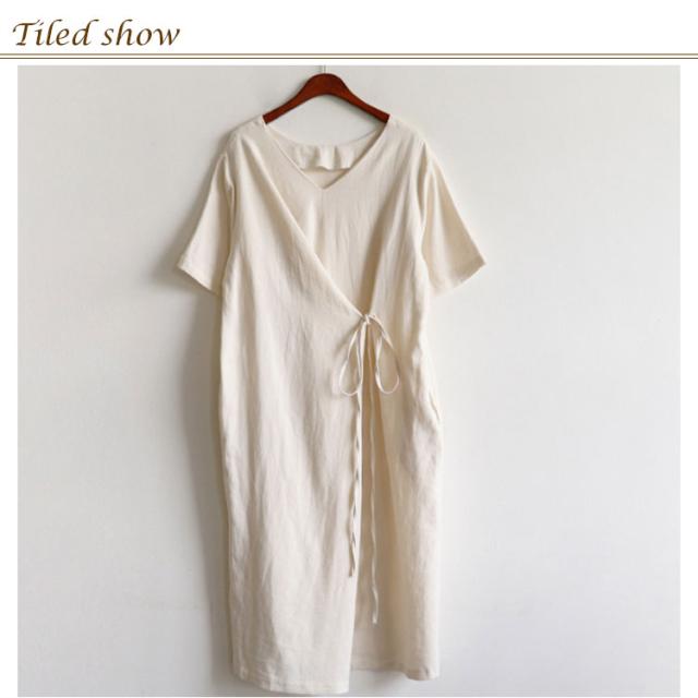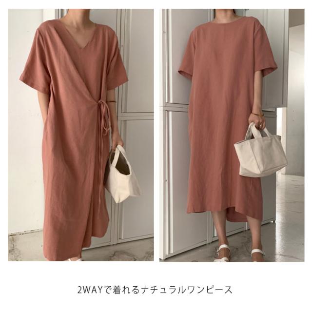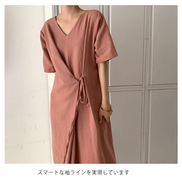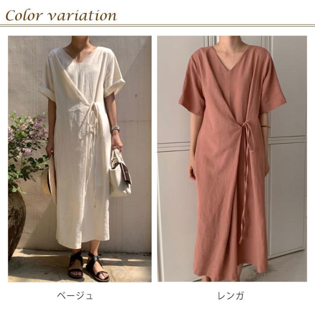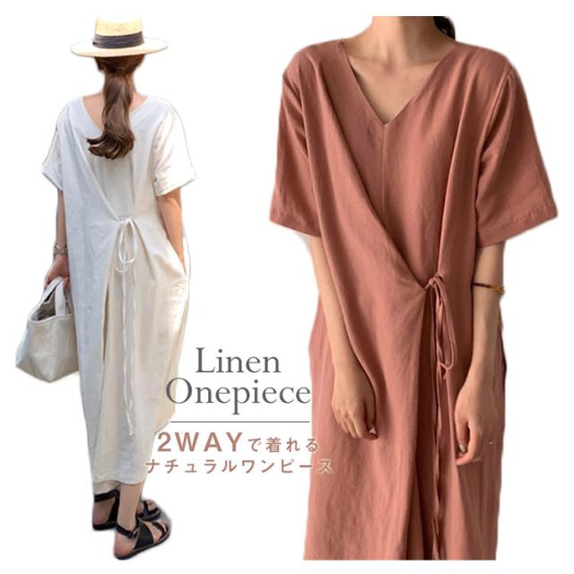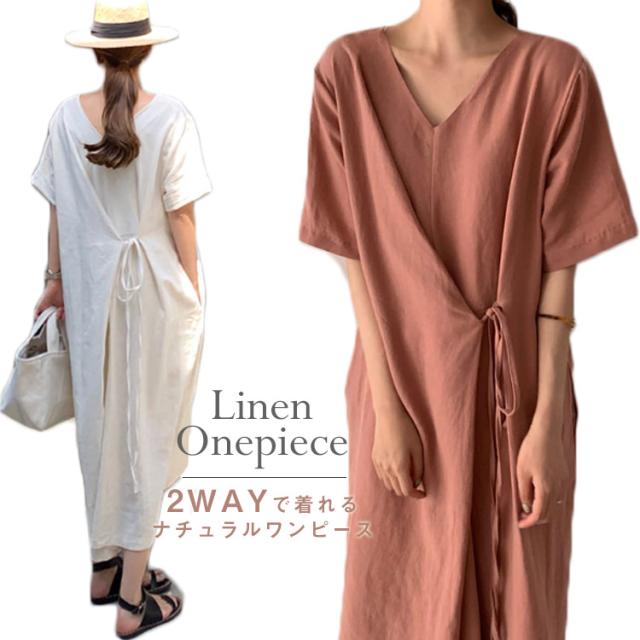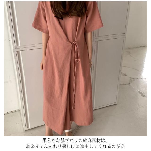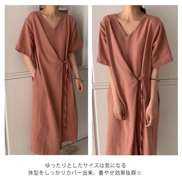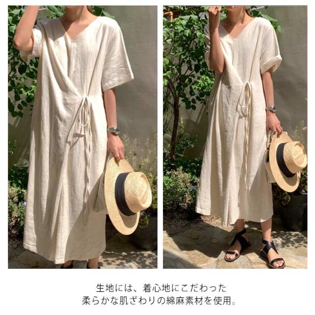 リネンワンピース ウエストリボン レディース 綿麻 ワンピース ミモレ丈 リネン ワンピース Aライン ワンピース ロングワンピース 半袖 ワンピース リネンワンピース 綿麻ワンピース 体型カバー 送料無料